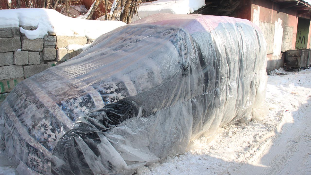 Bazı sürücüler, araçlarını naylon ve brandalarla sararken, binaların çatılarından sarkan buzların boyu 2 metreye ulaştı.
