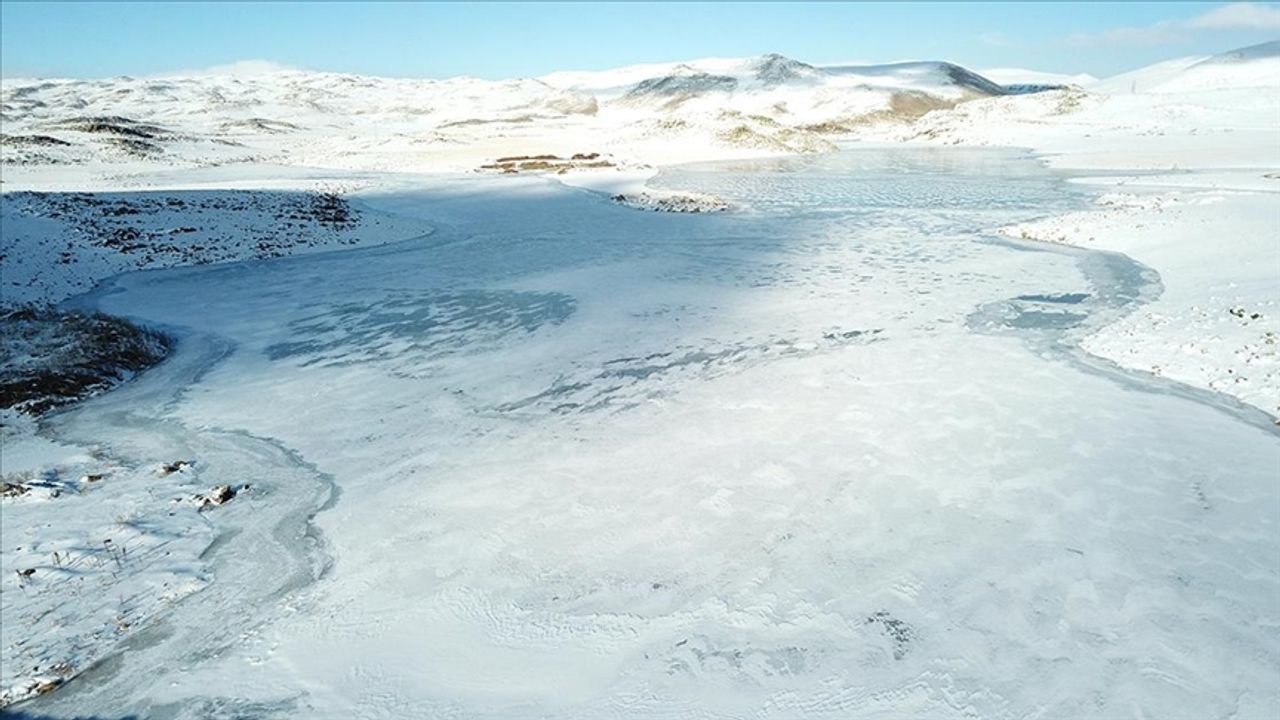 Yukarı Toklu köyünün üst tarafında bulunan baraj, dondurucu soğukların etkisiyle buzla kaplandı. Çevresi karlı dağlarla kaplı olan ve güzel manzara oluşturan barajın buzla kaplı yüzeyi dronla görüntülendi.