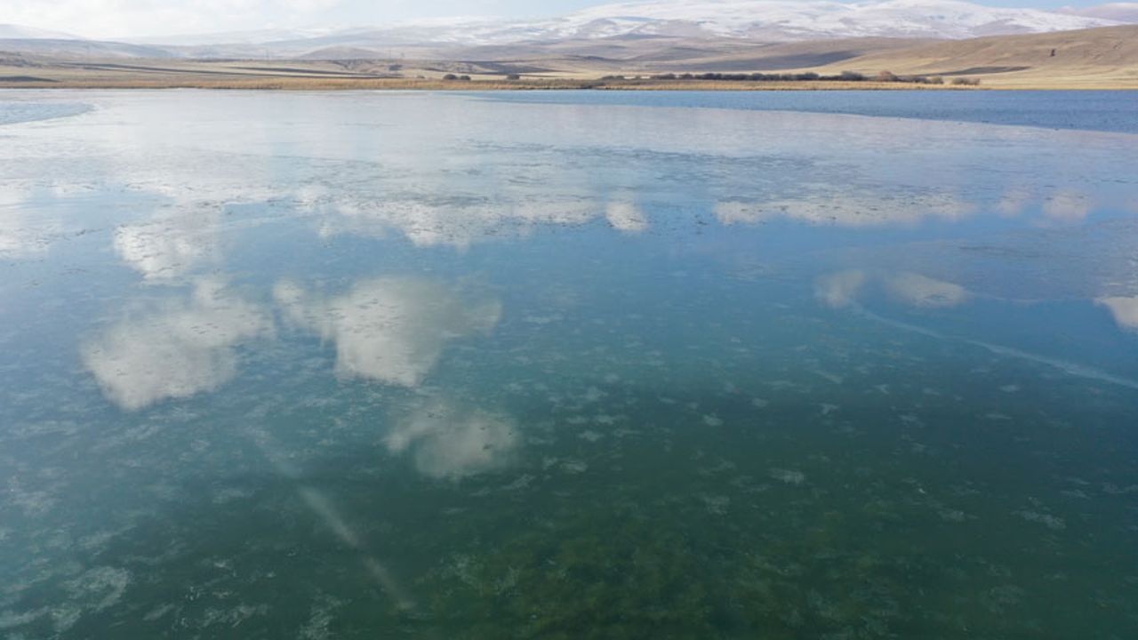 Kars-Ardahan sınırı arasında yer alan Çıldır Gölü'nün, Taşbaşı köyü mevkisindeki kenar kısımları dondu. Gölün donmayan bölümlerinde ise ördek ve sakarmeke kuşları yiyecek aradı.