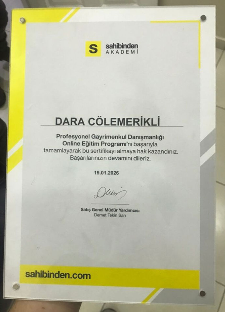Öte yandan firma yetkilisi Dara Çölemerikli, Sahibinden Akademi bünyesinde düzenlenen “Profesyonel Gayrimenkul Danışmanlığı Online Eğitim Programı”nı başarıyla tamamlayarak sertifika almaya hak kazandı. 19 Ocak 2026 tarihli sertifika, sektörel bilgi birikiminin ve profesyonel yaklaşımın resmi bir göstergesi niteliği taşıyor.
