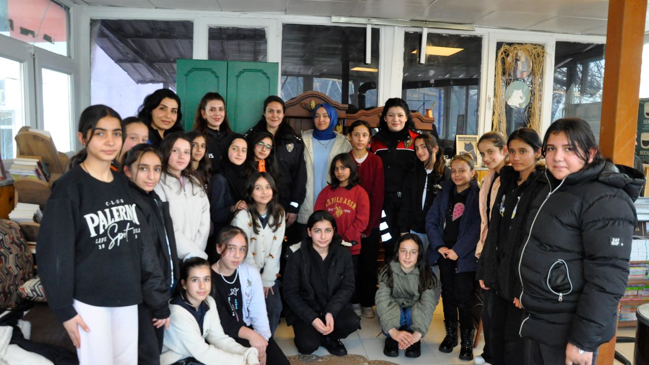 İlçedeki Kitap Kafe'de düzenlenen etkinlikte çocuklara güvenlik ve sosyal sorumluluk konularında bilgi verildi. Polislerle kitap okuyan öğrencilerin eğlenceli vakit geçirmeleri sağlandı.