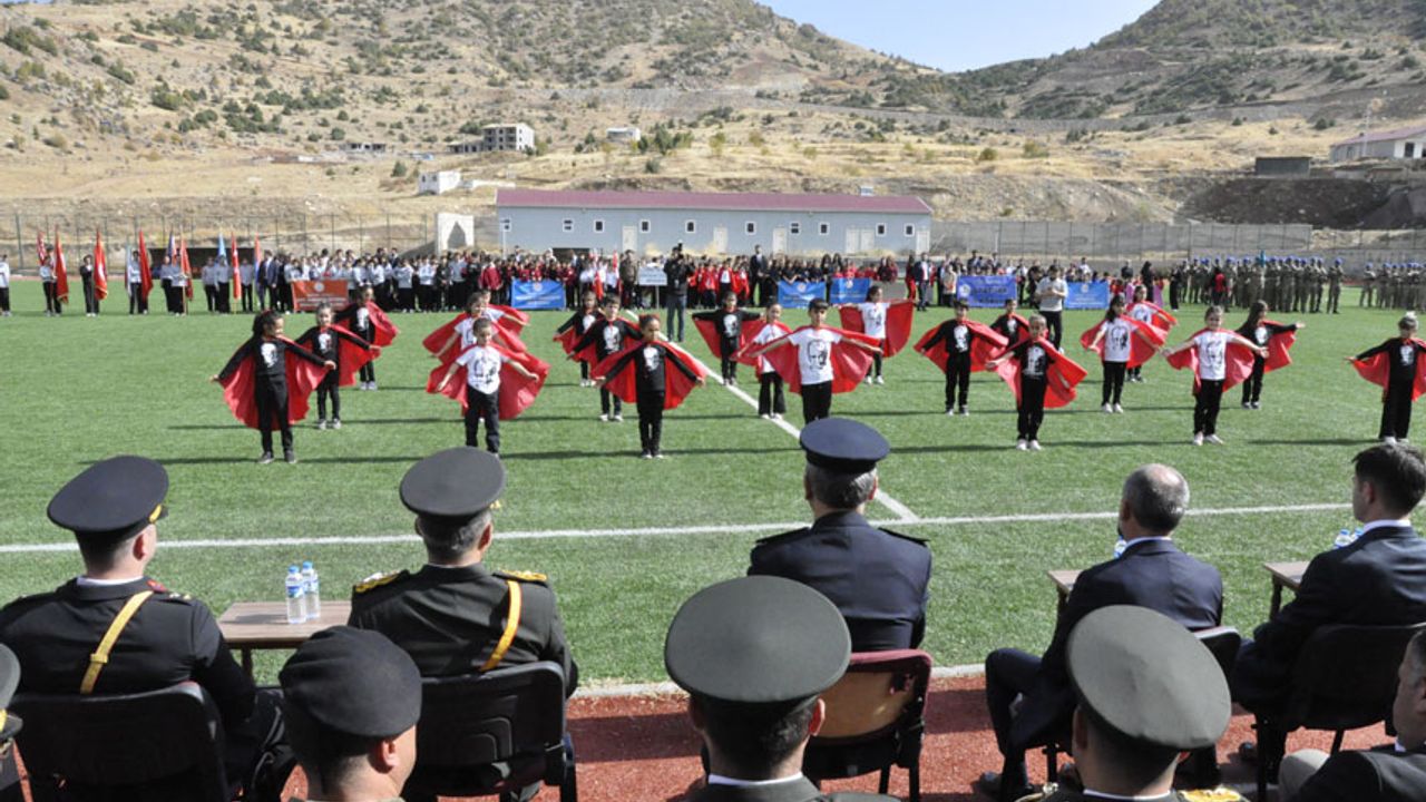 ÇUKURCA - İlçe stadında düzenlenen törende, saygı duruşunda bulunuldu, İstiklal Marşı okundu.