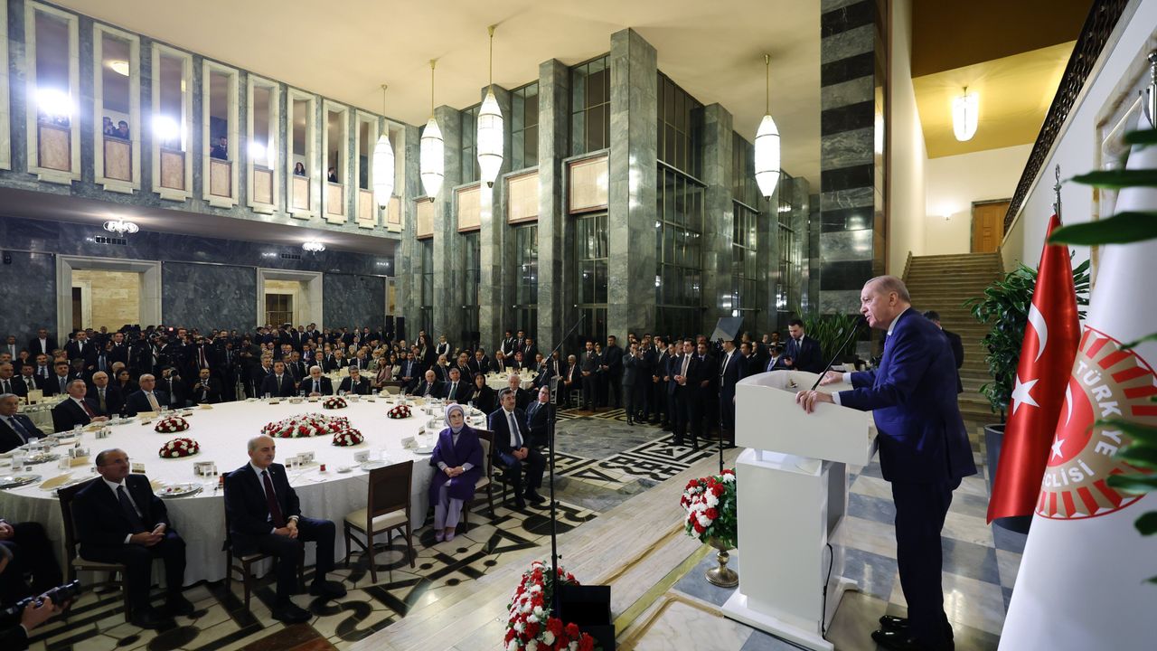 Cumhurbaşkanı Erdoğan, TBMM'de 'Milletvekilleri ile İftar' programına katıldı. Burada konuşan Erdoğan, "Milli Mücadele'nin en sancılı günlerinde İstiklal Harbimizin Başkomutanı Gazi Mustafa Kemal'in Yüce Meclisimizin kürsüsünden okuduğu, 'Ölmez bu vatan, farz-ı muhal, ölse de hatta, çekmez kürenin sırtı o tabut-u cesimi' mısralarında vücut bulan 'ya istiklal ya ölüm' inancını müstevlilere meydan okuyan yiğitlerin mukaddes davasını bir kez daha kemali hürmetle selamlıyorum. Bu vatan ölmez. Ölmesi farz-ı muhaldır. O farz-ı muhal gerçekleşse de dahi tüm dünya bu ağırlığın altında kalıp çökecektir. Bunun için 'Türkiye Türkiye'den büyüktür' cümlesi sıradan bir söz, hamasi bir söylem asla değildir. Bu ifade Gazi Meclisimizin isminde de zikredildiği gibi kendi varlığının farkında olan bir milletin inancının, iradesinin, aşkının tespit ve tescilidir. Asil ve asıl olan milletin vekilleri olarak bugün o inancı sizler temsil ediyorsunuz. O aşkı sizler temsil ediyorsunuz. O iradeyi sizler temsil ediyorsunuz. Şahsım, ülkem ve milletim adına her birinize ayrı ayrı teşekkür ediyorum" diye konuştu.