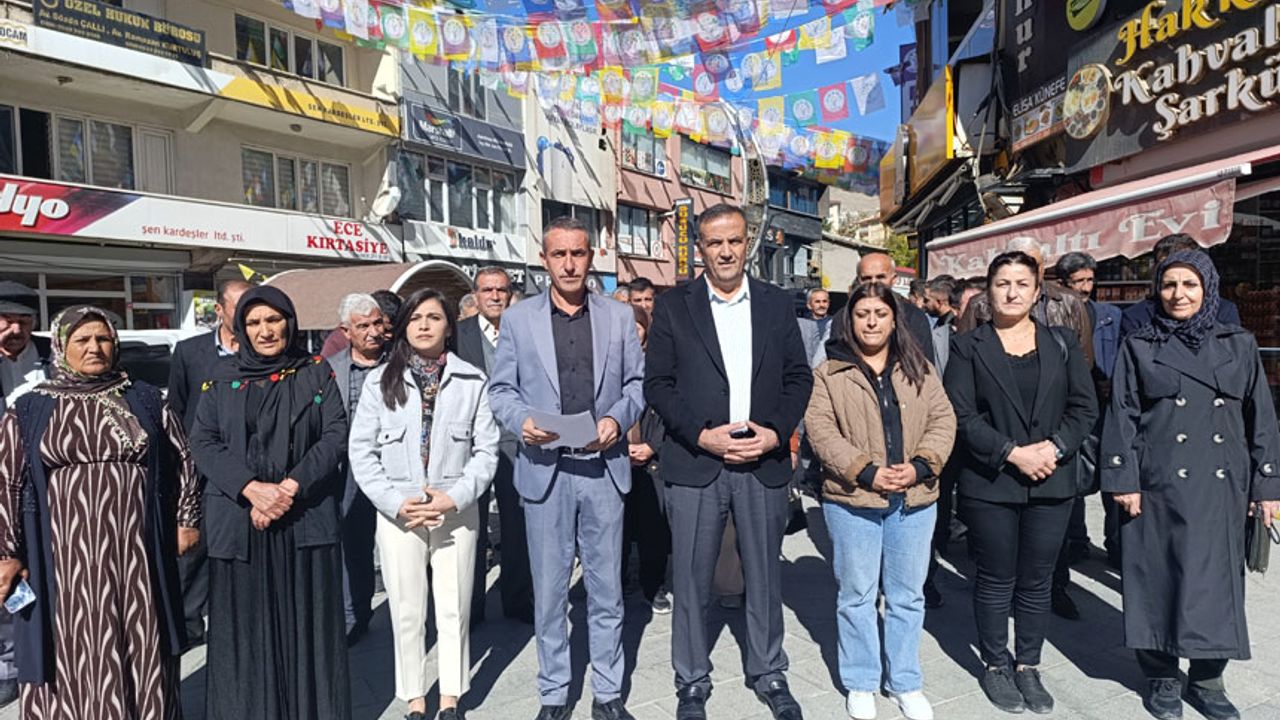 DEM Parti Hakkari İl Binası önünde yapılan açıklamaya DEM Parti İl Eş Başkanları Evin Tan ve Behçet Kanat, İl Genel meclisi eş başkanı Asiye Akgül, DEM Parti PM üyesi Nurullah Çiftçi ile parti yöneticileri katıldı.