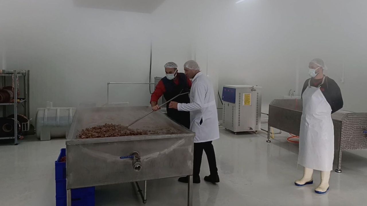 Kurdukları tesis hakkında bilgi veren işletme müdürü Alparslan Ercan, 750 metrekare kapalı alan üzerine kurulan tesiste sucuk, pastırma, kavurma üretimi yapıldığını söyledi.