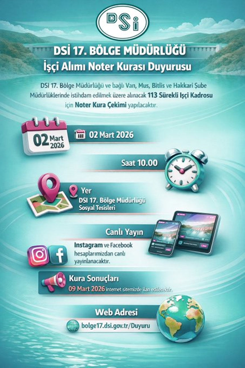 Noter huzurunda yapılacak kura çekiminin 02 Mart 2026 Pazartesi günü saat 10.00’da gerçekleştirileceği bildirildi. Kura sonucunda belirlenen adaylara ilişkin bilgiler ve süreçle ilgili detayların, DSİ 17. Bölge Müdürlüğü’nün resmi sosyal medya hesapları üzerinden kamuoyuyla paylaşılacağı kaydedildi.