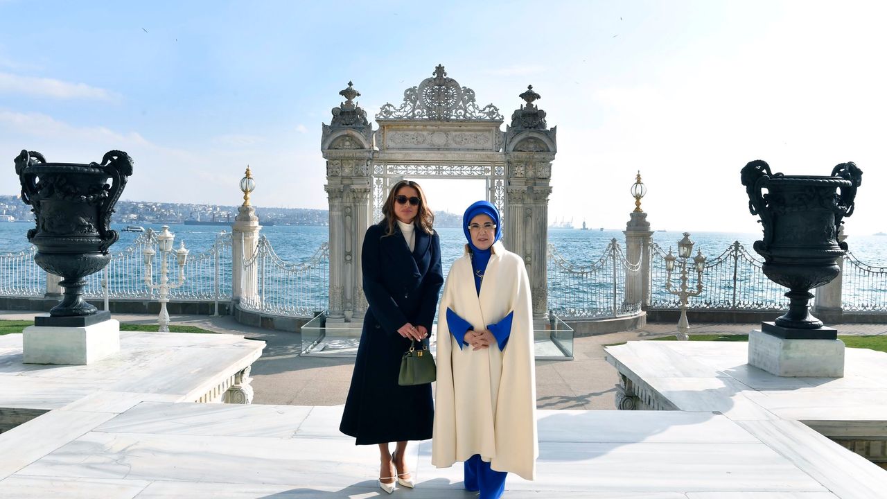 Cumhurbaşkanı Recep Tayyip Erdoğan'ın eşi Emine Erdoğan, Ürdün Kraliçesi Rania Al Abdullah'ı Dolmabahçe Sarayı'nda ağırladı. Emine Erdoğan, Kraliçe Al Abdullah'ı Dolmabahçe Sarayı'nın Muayede Salonu girişinde samimiyetle karşıladı. Birbirlerine sarılarak selamlaşan ve sohbet eden Emine Erdoğan ile Rania Al Abdullah, sarayın kristal merdivenleri önünde fotoğraf çektirip, Medhal Salonu'na geçti.