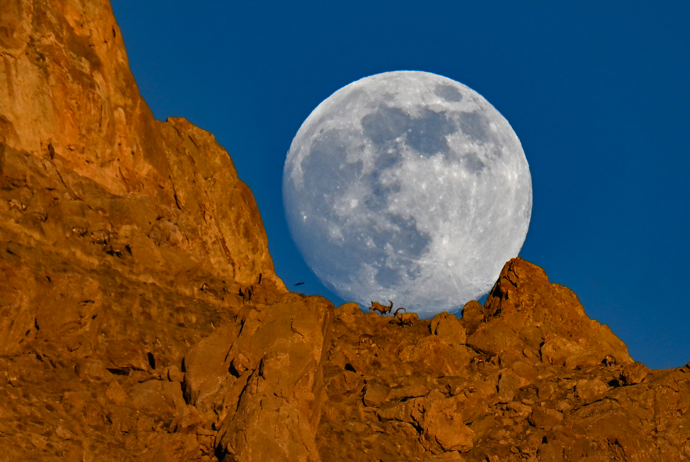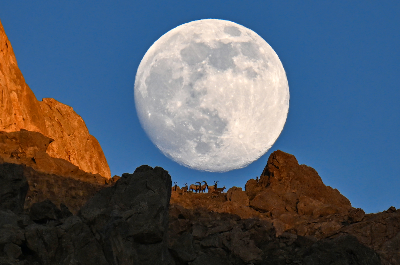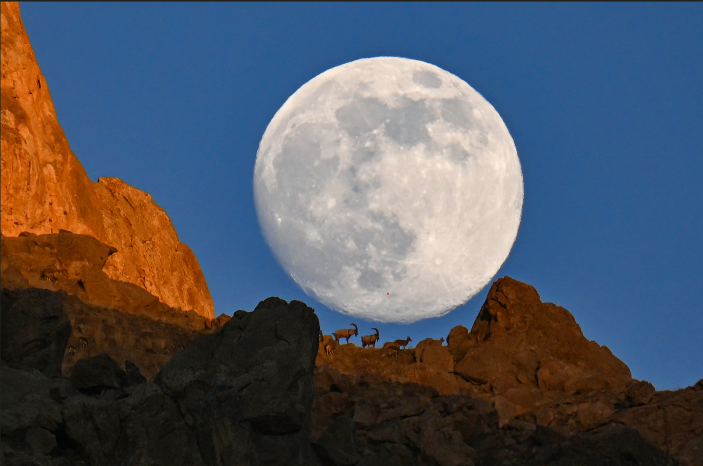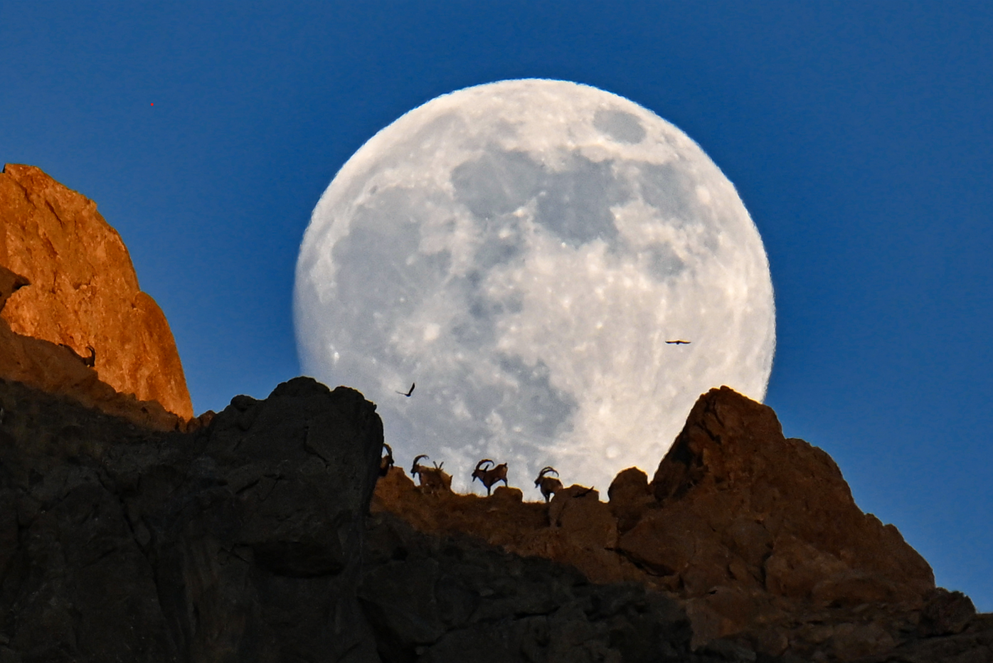 Van'ın Gürpınar ilçesinde nesli koruma altındaki yaban keçileri, dağın arkasından yükselen dolunayla birlikte görüntülendi.