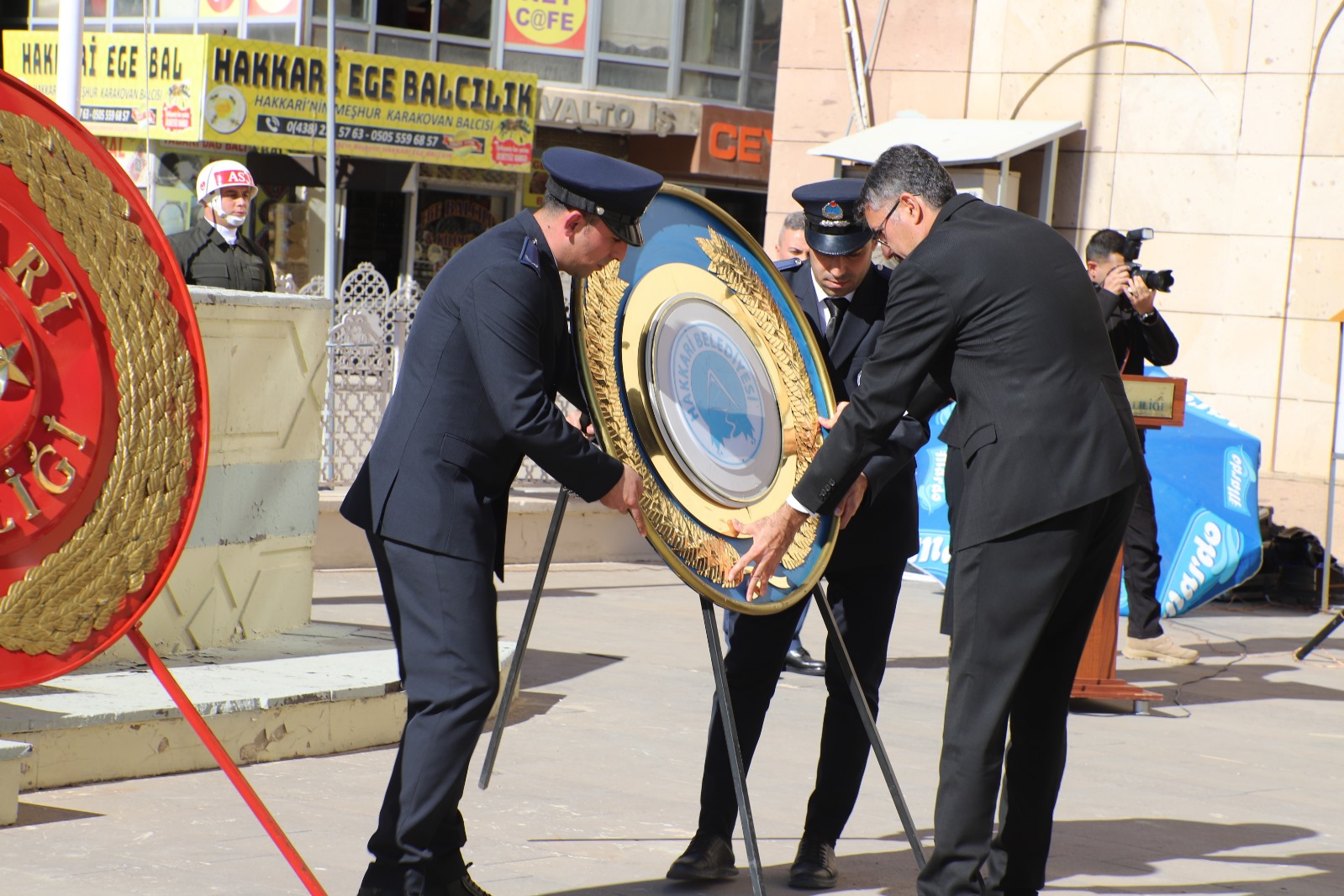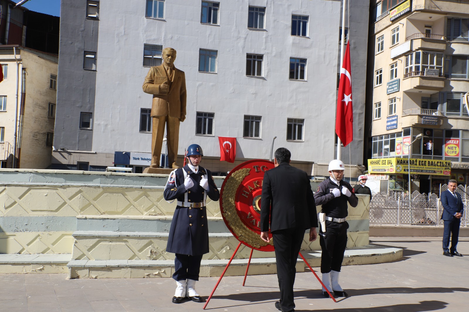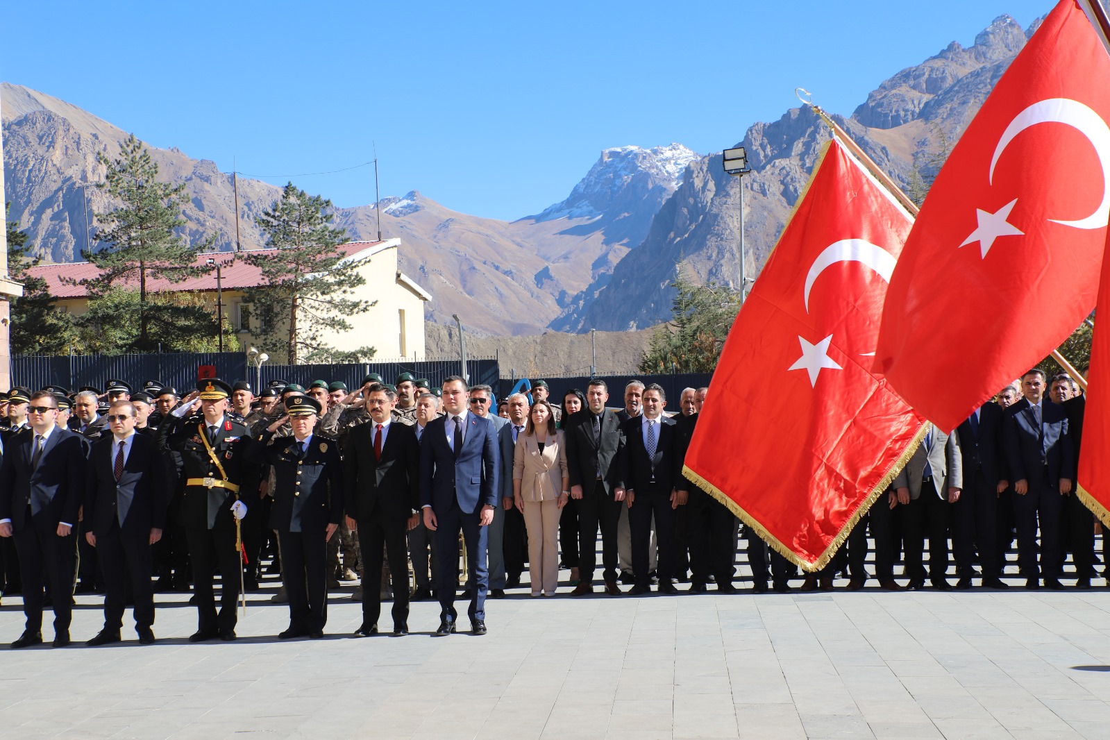 HAKKARİ- Tören; Vali Ali Çelik ve Yüksekova 3. Piyade Tümen Komutanı Tümgeneral Ferat Vural tarafından, Hakkari Valiliği, Hakkari Belediyesi ve Garnizon Komutanlığı çelenklerinin Atatürk Anıtı’na sunulmasıyla başladı. Ardından saygı duruşu ve İstiklal Marşı’nın okunması ile program devam etti.