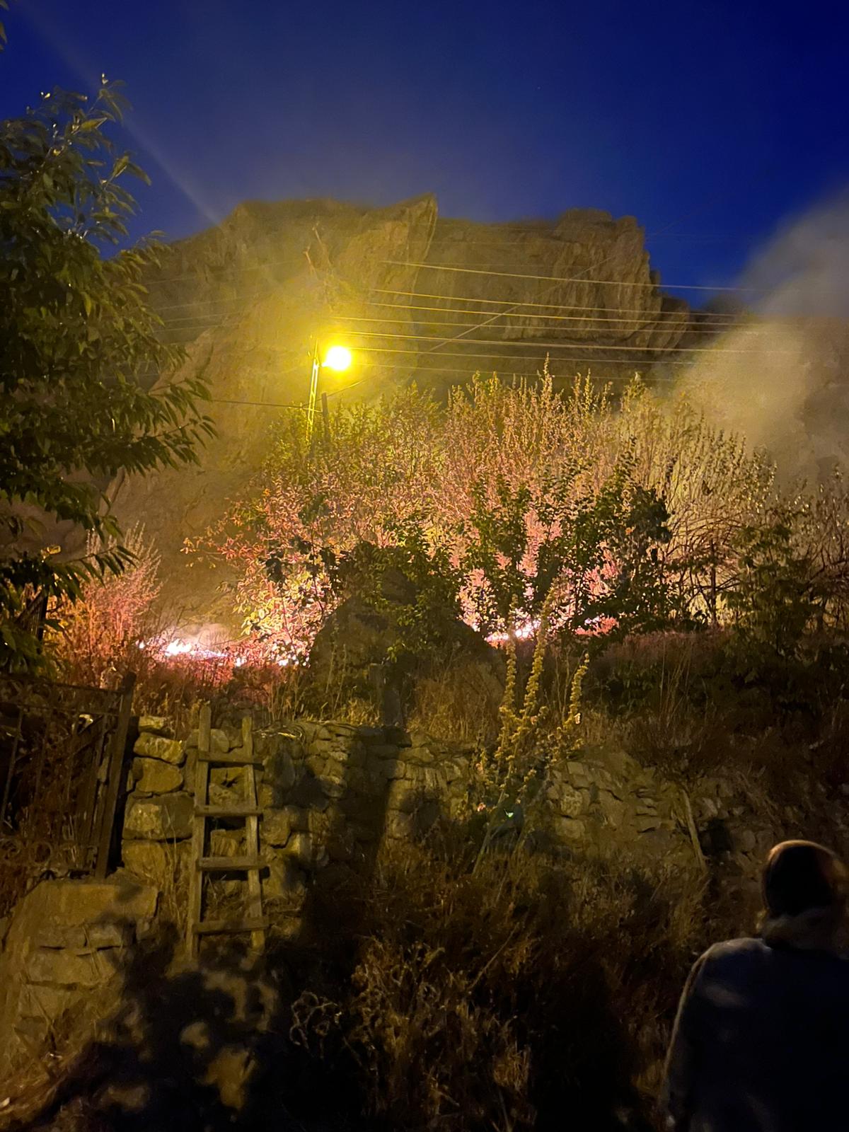HAKKARİ- Edinilen bilgilere göre, Biçer Mahallesi Melik Esat Camisi mevkiinde mezarlıkta yakılan çöplerden sıçrayan alevler, çevredeki kuru otların tutuşmasına neden oldu.