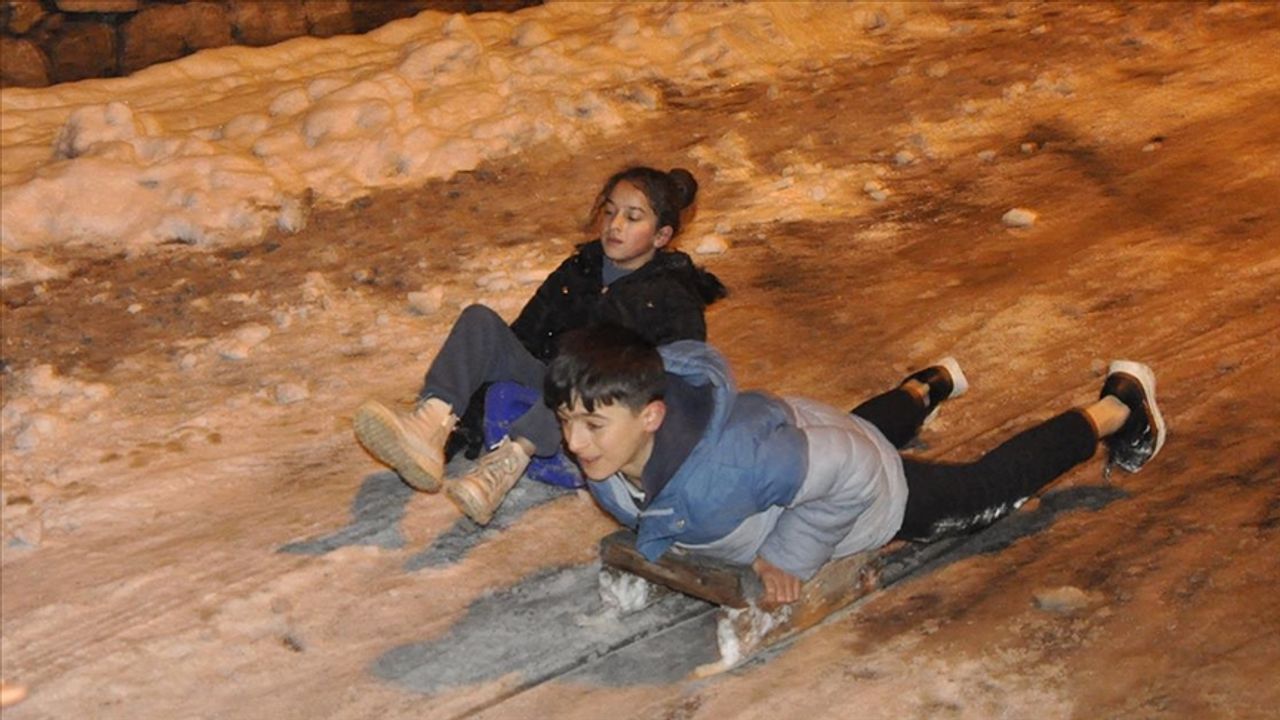 Kar yağışını fırsat bilen çocuklar da plastik bidonlar ve tahtadan yapılan kızaklarıyla kayarak karın keyfini çıkardı.
