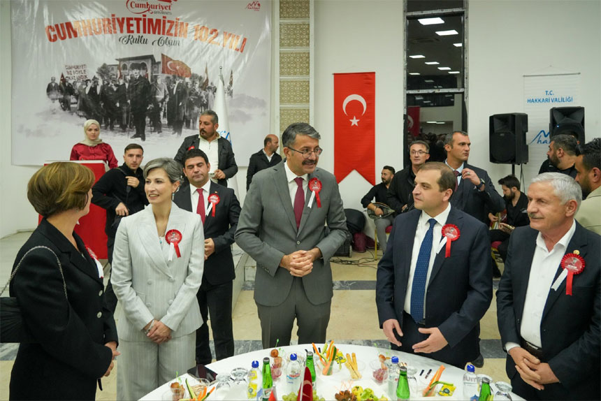 Vali Çelik, konuşmasına “Cumhuriyetimizin 102. yıl dönümünü Hakkâri’de sizlerle beraber, dağların şehrinde, bayrağımızın gölgesinde kutlamanın onurunu, coşkusunu ve mutluluğunu yaşıyorum. Derecik’ten Şemdinli’ye, Yüksekova’dan Çukurca’ya kadar siz değerli dostlarla bu akşam burada olmak bizleri bu birlik ve beraberlik gölgesi altında ziyadesiyle mutlu ediyor.” dedi.