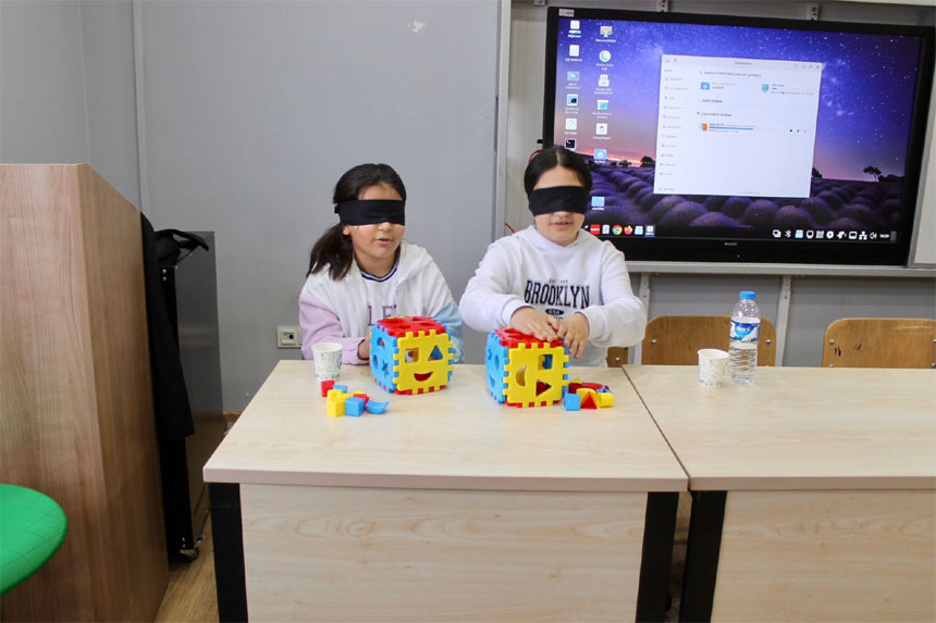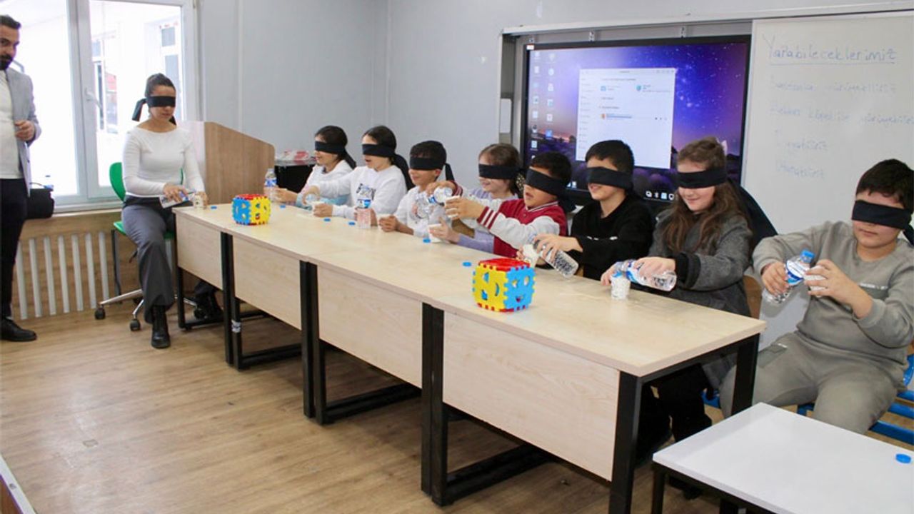Program, görme engelli bireylerin yaşamlarına dair hazırlanan farkındalık videosunun izletilmesiyle başladı. Video gösteriminin ardından öğrenciler, görme engelli bireylerin günlük hayatta karşılaştıkları durumları daha iyi anlayabilmek amacıyla gözleri kapalı şekilde çeşitli uygulamalara katıldı. Bu kapsamda öğrenciler; pet şişe açma, bardağa su doldurma, nesneleri yerlerine yerleştirme ve yön bulma parkurunda ilerleme gibi etkinlikleri deneyimledi.