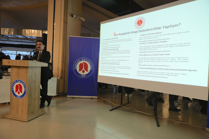 Hakkari Cumhuriyet Başsavcılığı tarafından başlatılan çalışma kapsamında öğrenciler, bilişim sistemleri üzerinden gerçekleştirilen dolandırıcılık olayları ve internet suçları hakkında bilgilendirildi. Bu kapsamda, Cumhuriyet Başsavcılığı ile üniversite iş birliğiyle sunum gerçekleştirildi.
