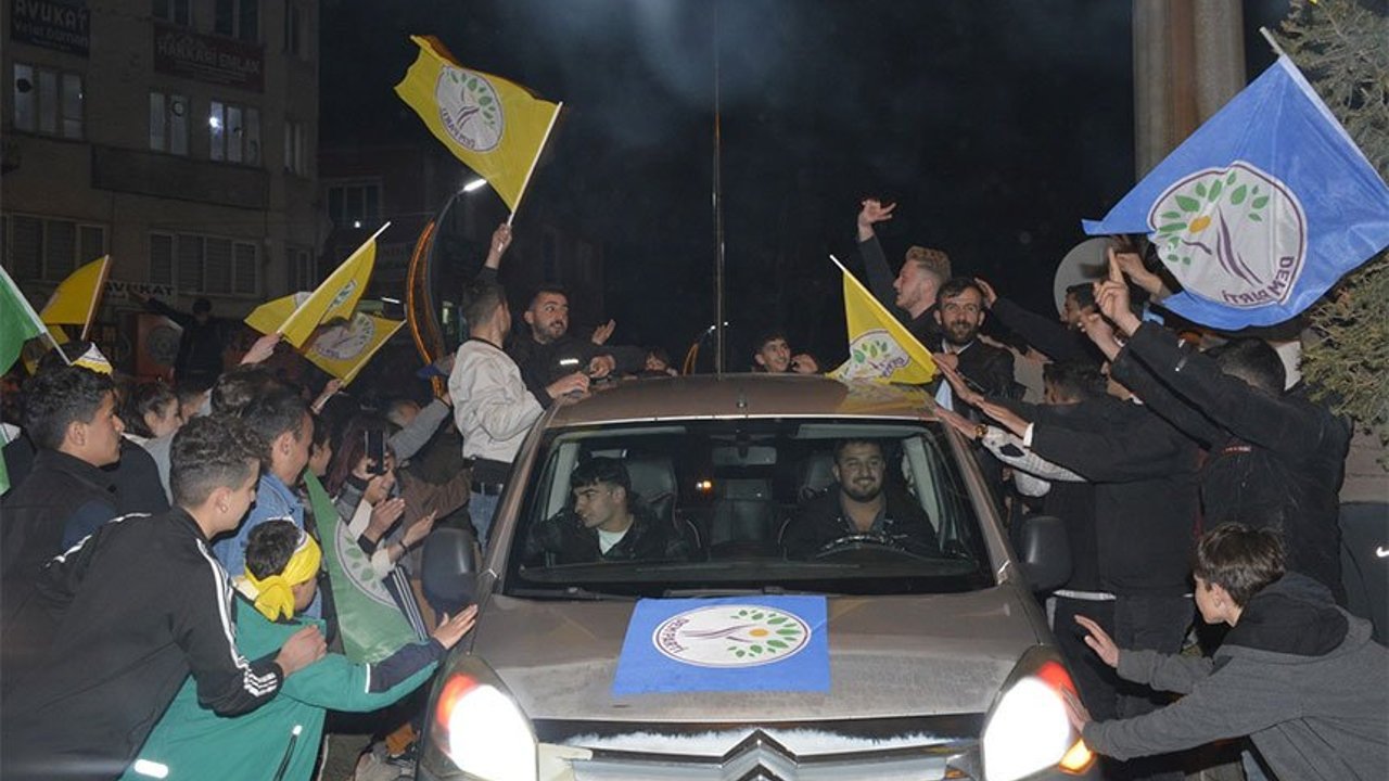 DEM Parti bayrak ve flamaları ile Kürtçe müzikler eşliğinde halay çeken binlerce kişi araçları ile şehir duru yapıp havai fişek atarak seçim başarısını kutladı.