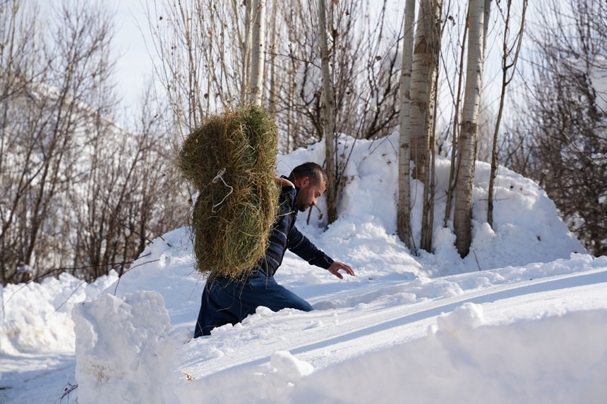 Binbir güçlükle ahırlara ulaşabilen hayvan sahipleri, yazın biçerek ahırlarına yakın bölgelere istifledikleri otları kar altından çıkarıp bazen sırtlarında, bazen de naylon ve kızakların üzerinde taşıyarak küçükbaş hayvanlarını besliyor.