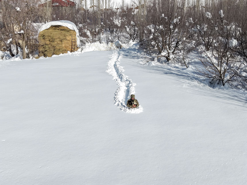 Evinden 300 metre ilerideki ahırına karda bata çıka giden, bazı yerlerde ise karda batmamak için dizlerinin üstünde hareket eden Kılıç, "Ahırlarımızın patika yolunu açmaya çalışırken kar neredeyse göğsümüze kadar geliyor. Uzun yıllardır bu kadar aşırı kar yağmamıştı." diye konuştu.