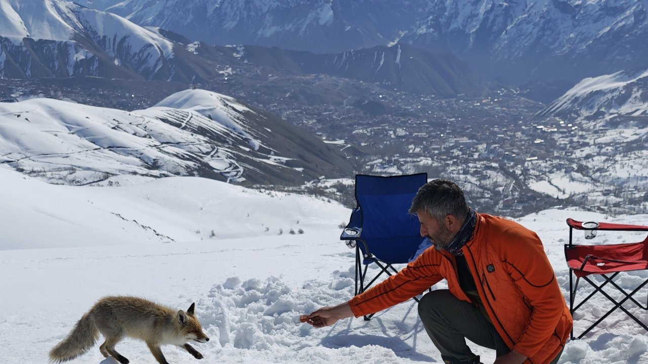 HAKKARİ-Hakkari’de doğa yürüyüşüne çıkan Cilo Sat Gölleri ve Buzulları Dağcılık ve Doğa Sporları Kulübü (CİSAD) üyeleri Mergabütan Kayak Merkezi yakınlarında karşılaştıkları aç bir tilkiyi elleriyle besledi.