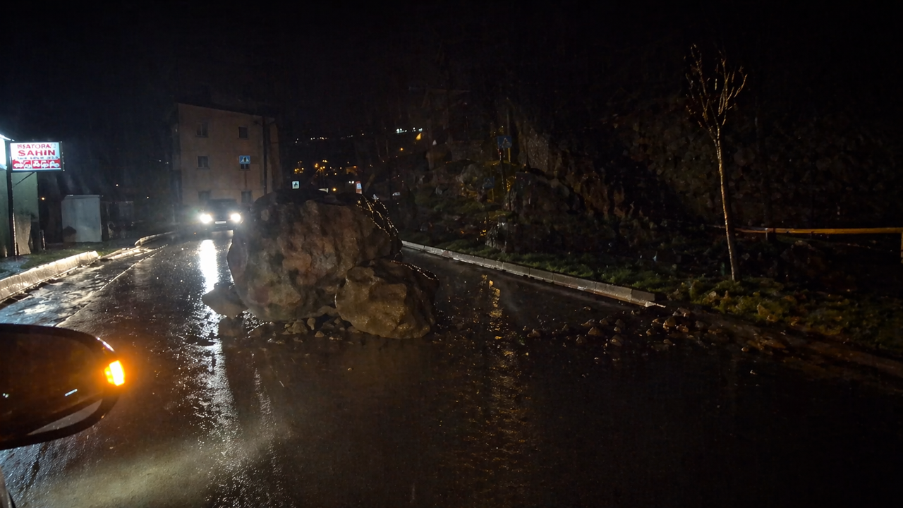 HAKKARİ-Hakkari’nin Şemdinli ilçesinde etkili olan yağışın ardından dağdan kopan büyük bir kaya parçası, Sanayi Kavşağı mevkiinde karayoluna düştü. Gece saatlerinde meydana gelen olayda, yola düşen dev kaya nedeniyle ulaşım geçici olarak durdu.