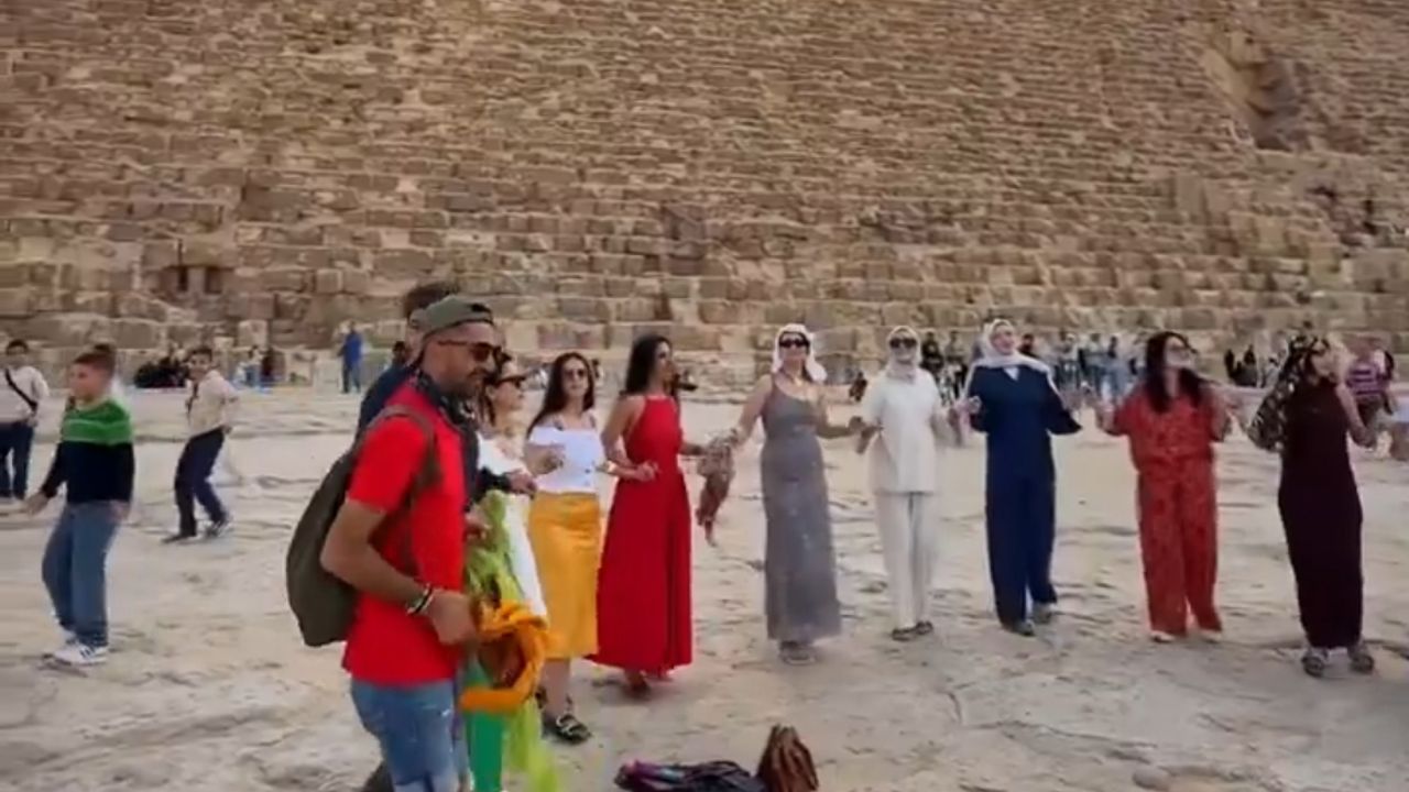Gençlerin coşkulu anları, antik piramitlerin görkemli silüetiyle birleşince ortaya hem eğlenceli hem de kültürel açıdan dikkat çekici görüntüler çıktı.