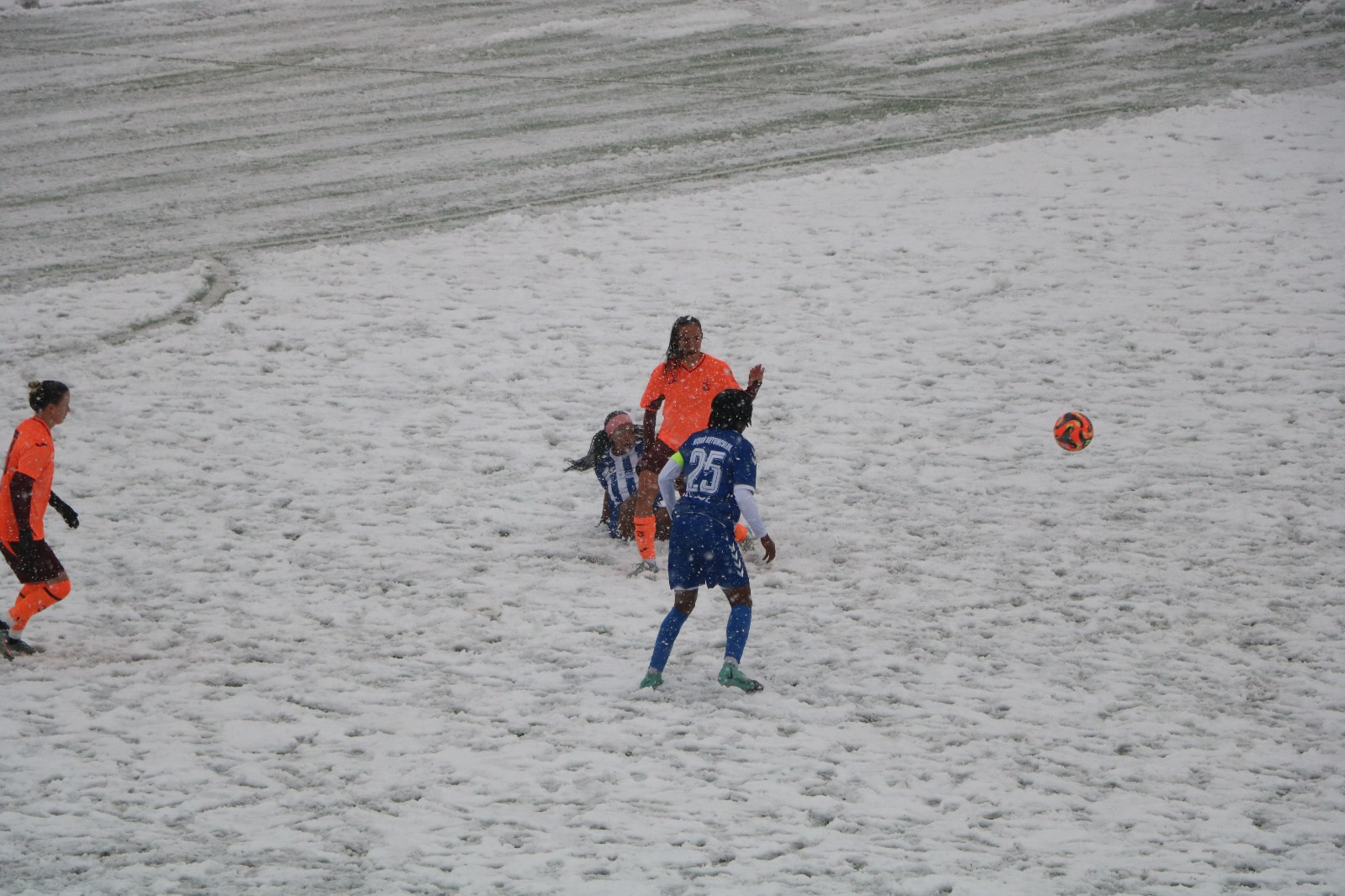 Yoğun kar yağışı nedeniyle hakem karşılaşmayı zaman zaman durdurarak, saha görevlilerinin çizgileri yeniden belirlemesine fırsat verdi.