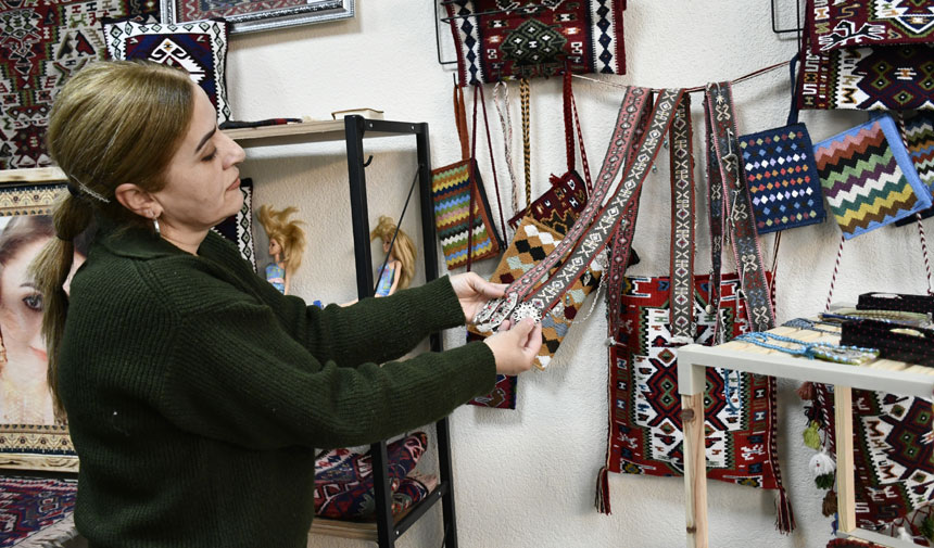 Atölyesinde kilimin yanı sıra farklı ürünler de ürettiğini anlatan Bayram; cüzdan, küçük kilimler, heybeler, kırlentler, anahtarlıklar, kolyeler, bileklikler ve çeşitli aksesuarlar yaptıklarını ifade etti.