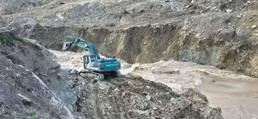 Heyelanlı bölgenin yanından geçen dere yatağına yapılan müdahaleler ve akış kesitinin daralması da çalışmaları olumsuz etkiliyor.