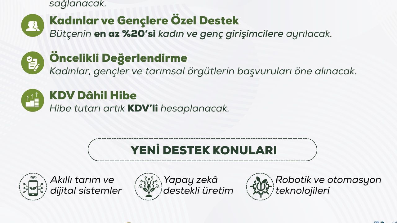 Kırsal kalkınma bütçemizin en az yüzde 20’sini kadın ve genç girişimcilerimize ayırıyoruz. Başvurularda kadınlar, gençler ve birinci derece tarımsal örgütleri önceliklendiriyoruz. Dijital tarım, yapay zekâ ve otomasyon uygulamalarını hibe kapsamına alarak kırsal dönüşüme hız kazandırıyoruz. Öncelikli değerlendirme, artırılmış hibeler ve yeni destek alanlarıyla kırsalda üretim güçleniyor, Türkiye büyüyor. Hayırlı olsun" ifadelerini kullandı.