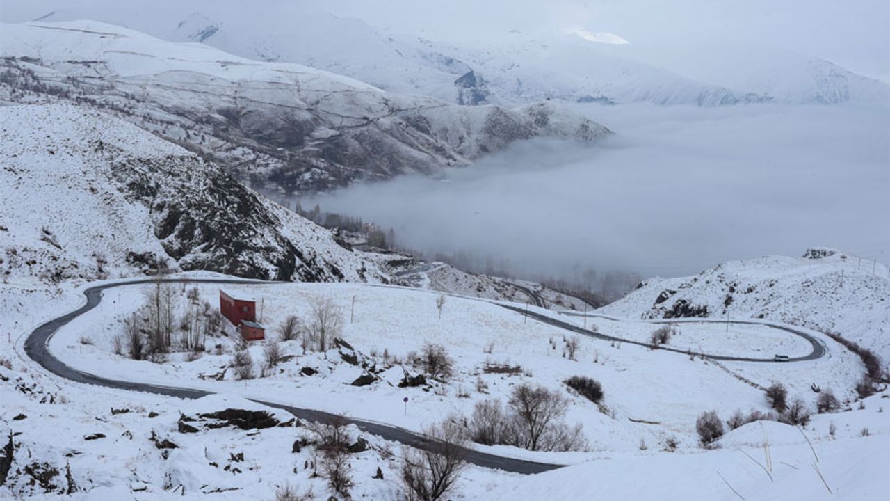 Merga Bütan Kayak Merkezi’nin eteklerinden görülen manzaralar, şehir merkezini adeta sis altında bıraktı; bir yandan beyaz kar, diğer yandan dağ ve sisin birleşimi Hakkari’ye eşsiz bir kuş bakışı görünüm kazandırdı.