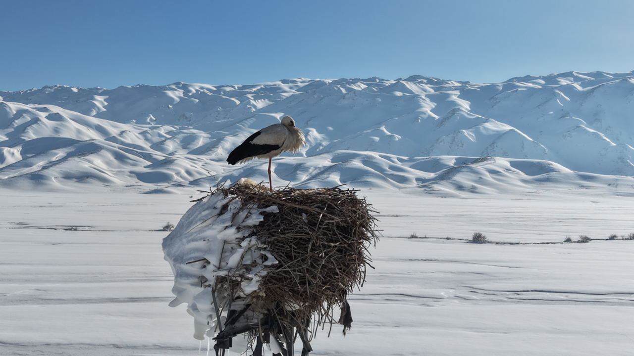 Görüntülerde ayrıca, kış mevsiminde elektrik direği üzerine yuva kurduğu görülen leylek de dikkat çekti. Karla kaplı ovada kısmen buz tutmuş yuvasında bekleyen leylek, kış manzarasıyla birlikte farklı bir görüntü sundu.