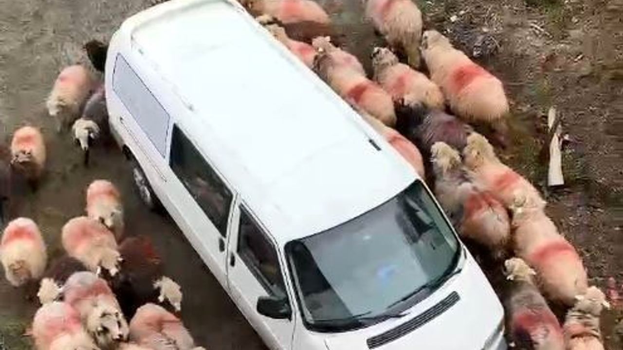 Otlama alanına yönelmesi beklenen koyunlar, bu kez park halindeki minibüsün çevresinde halka oluşturdu. Aynı hızla ve düzenli şekilde hareket eden sürü, dakikalar boyunca aracın çevresinde daire oluşturarak döndü.