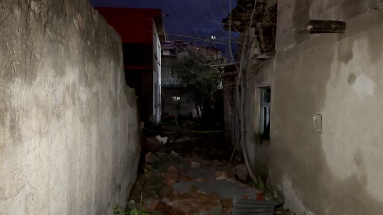 Vanimehmet Mahallesi Namık Kemal Caddesi'nde fırtına nedeniyle metruk bir binanın bahçe duvarı çöktü.