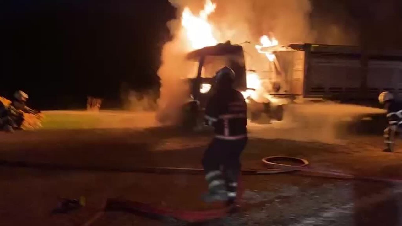 İtfaiye ekiplerinin müdahalesiyle söndürülen yangında tır kullanılamaz hale geldi.