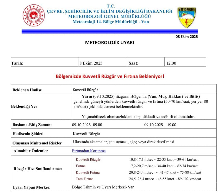HAKKARİ - Meteoroloji 14. Bölge Müdürlüğü, Hakkari, Van, Muş ve Bitlis illerinde yarın (9 Ekim 2025) sabah saatlerinden itibaren kuvvetli rüzgâr ve fırtına beklendiğini duyurdu.