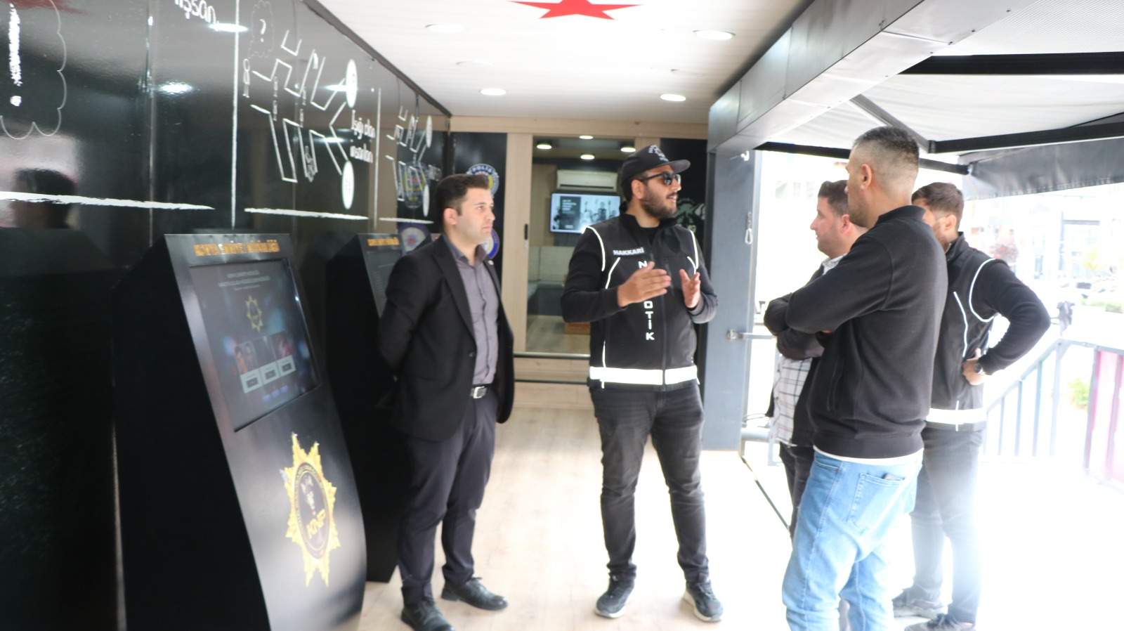 Polis ekipleri, tırı ziyaret eden öğrenci, genç ve ailelere farkındalık kazandırmak amacıyla detaylı bilgilendirmelerde bulundu.