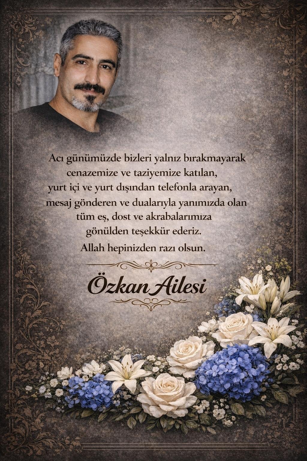 Özkan Ailesi, yayımladığı teşekkür mesajında, “Acı günümüzde bizleri yalnız bırakmayarak cenazemize ve taziyemize katılan, yurt içi ve yurt dışından telefonla arayan, mesaj gönderen ve dualarıyla yanımızda olan tüm eş, dost ve akrabalarımıza gönülden teşekkür ederiz. Allah hepinizden razı olsun.” ifadelerine yer verdi.