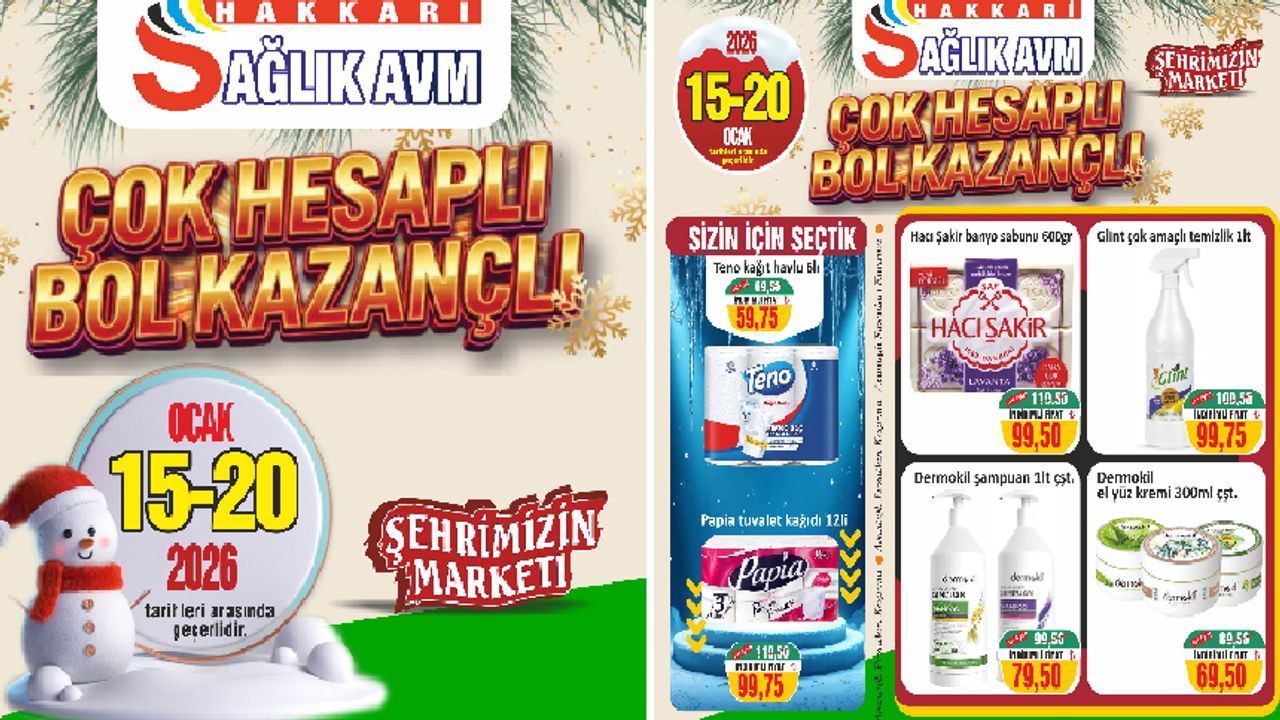 HAKKARİ – Kentin önde gelen alışveriş merkezlerinden Sağlık AVM, 'çok hesaplı bol kazançlı' sloganıyla yeni yılın ilk indirim kampanyasını başlattı. 'Şehrimizin marketi' sloganıyla düzenlenen indirim kampanyası 15 - 20 Ocak tarihleri arasında geçerli olacak.