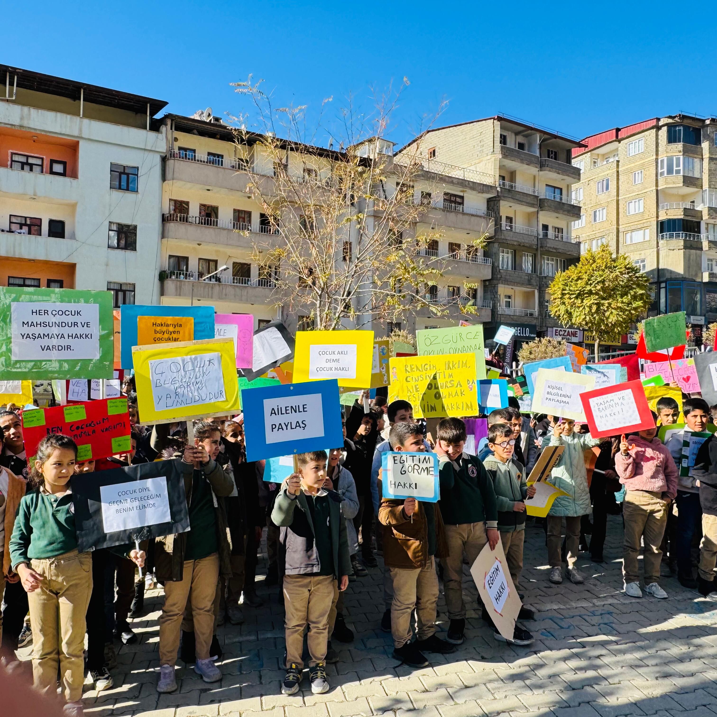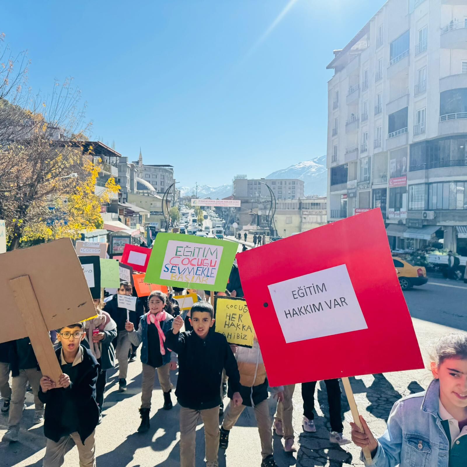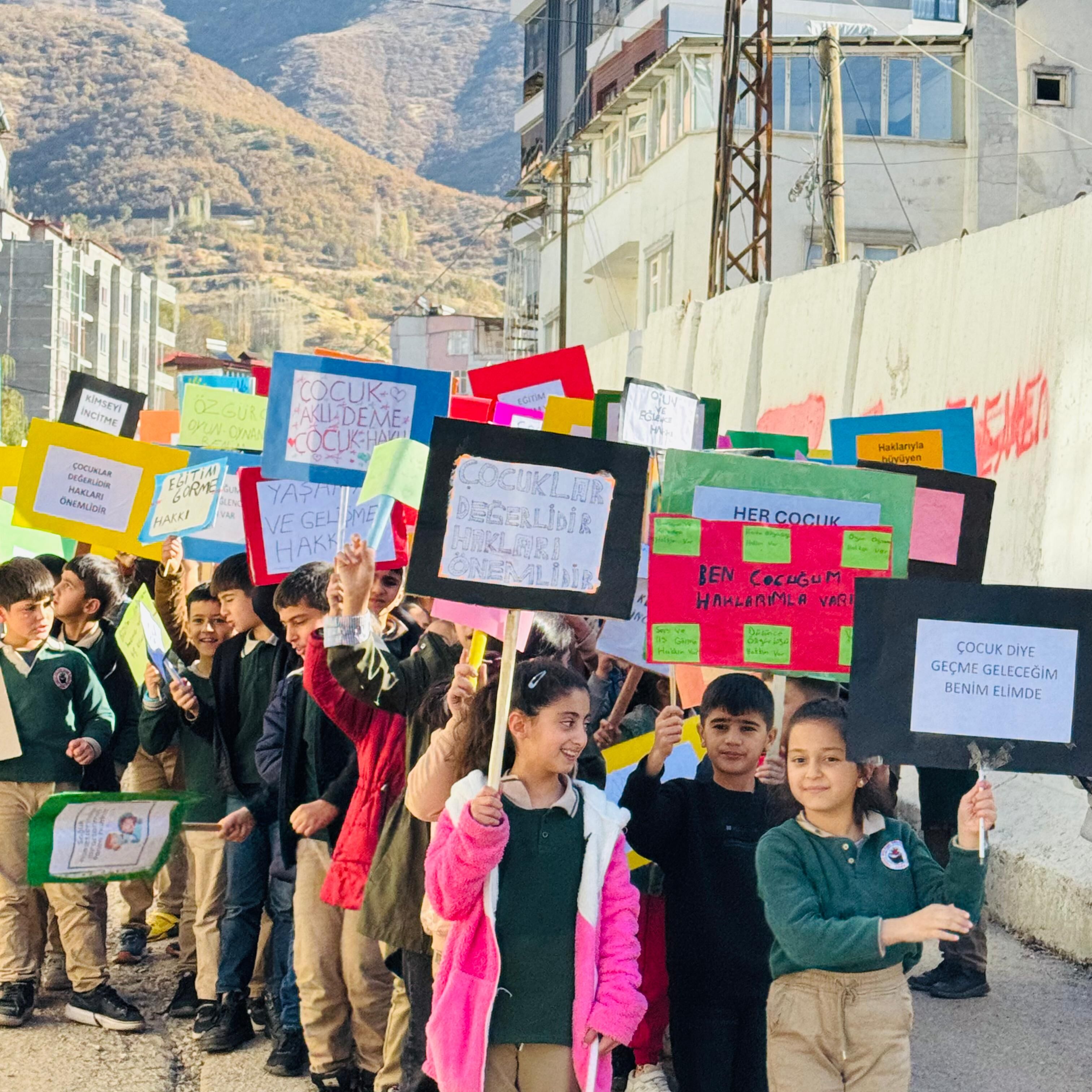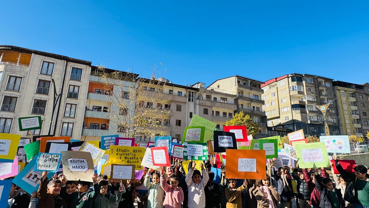 HAKKARİ -Ellerinde çeşitli döviz ve pankartlar taşıyan öğrenciler, çarşı merkezinde yürüyüş yaparak çocuk haklarına dikkat çekti.