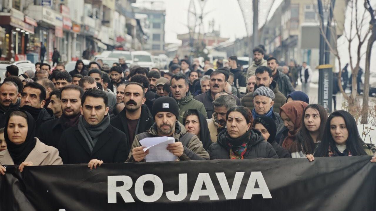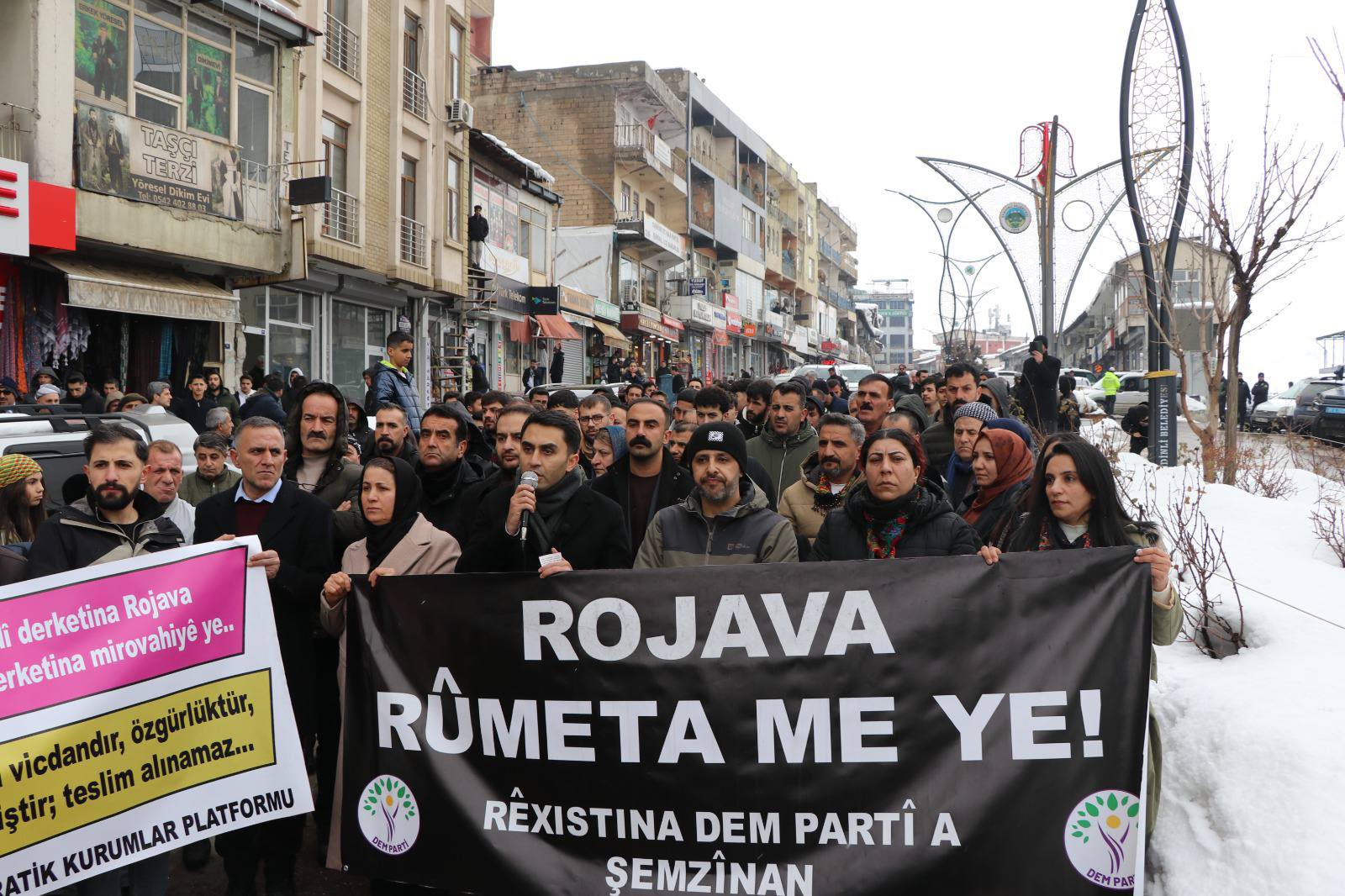ŞEMDİNLİ- Demokratik Kurumlar Platformu öncülüğünde gerçekleştirilen eylem kapsamında, DEM Parti Şemdinli İlçe Örgütü binası önünde toplanan grup, sloganlar eşliğinde Cumhuriyet Caddesi boyunca yürüyüş yaptı.