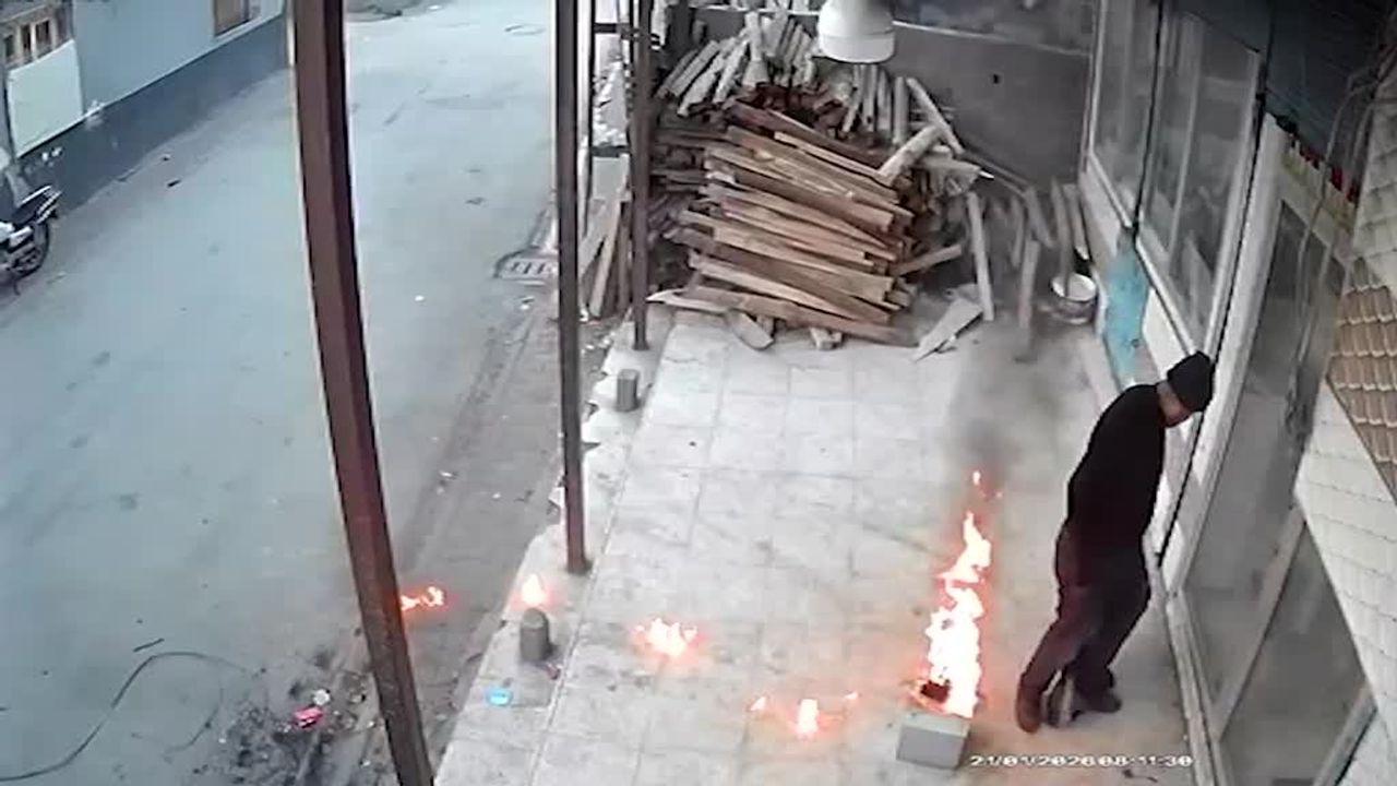 Alevin bir anda parlamasıyla ceketinin kolu tutuşan iş yeri sahibi, kıyafetlerini çıkarak ateşi söndürdü. İş yeri sahibinin yanmaktan son anda kurtulması, güvenlik kamerasınca kaydedildi.