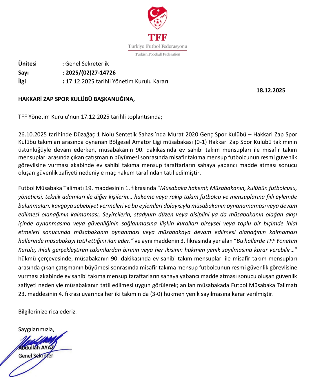 Hakkari Zap Spor cephesi, sahada maçın tatilini gerektirecek kulübü bağlayan herhangi bir olay yaşanmadığını, buna rağmen TFF Yönetim Kurulu’nun her iki takımı da hükmen mağlup saymasının adil olmadığını belirtti. Ayrıca, yaklaşık iki aydır bekletilen ve kulüp lehine hükmen 3-0 tescil edilmesi gerektiği belirtilen basit bir kararın neden geciktirildiği de kamuoyuna soruldu.