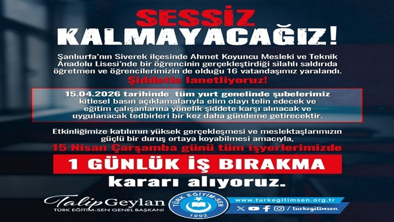 Türk Eğitim-Sen tarafından yapılan açıklamada, öğretmene yönelik şiddetin son bulması, eğitim kurumlarında etkili güvenlik tedbirlerinin bir an önce hayata geçirilmesi ve eğitim çalışanlarının güvenli bir ortamda görev yapabilmesi için iş bırakma eylemi kararı alındığı bildirildi.