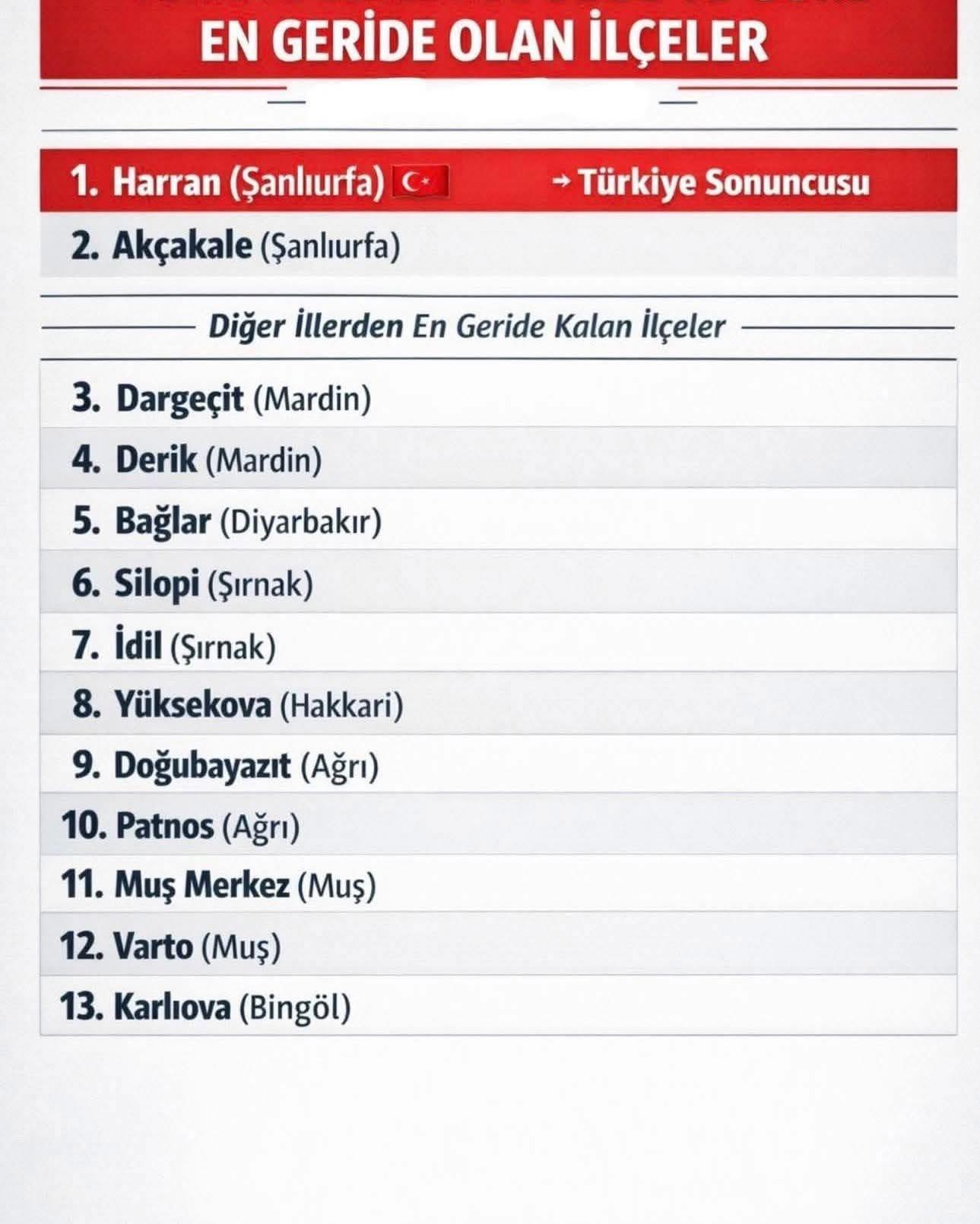 13 ilçenin bulunduğu listede Şanlıurfa'nın Harran ilçesi ilk sırada yer alırken Hakkari'nin Yüksekova ilçesinde 8. sırada yer aldı.
