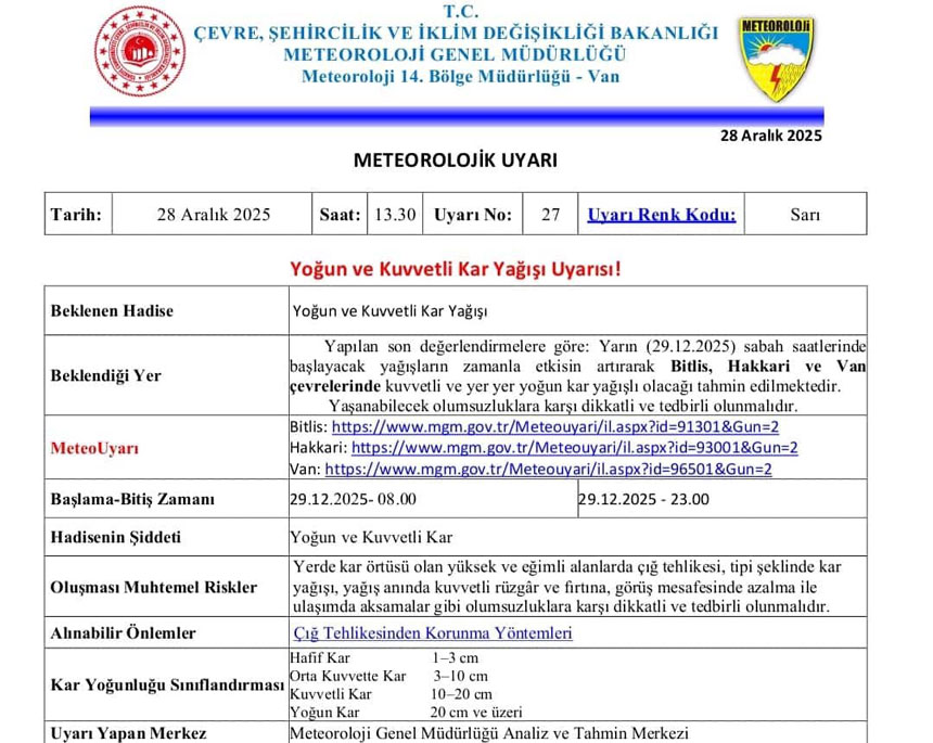 Valilik açıklamasında, 29 Aralık Pazartesi (Bugün) günü Hakkâri genelinde yoğun ve kuvvetli kar yağışı ile birlikte don ve buzlanma beklendiği belirtildi. Açıklamada, Pazartesi sabah saat 09.00’dan itibaren etkisini artıracak yeni bir kar yağışlı sistemin bölgeyi etkisi altına alacağı, hava sıcaklıklarının ise eksi derecelerde seyredeceği ifade edildi.
