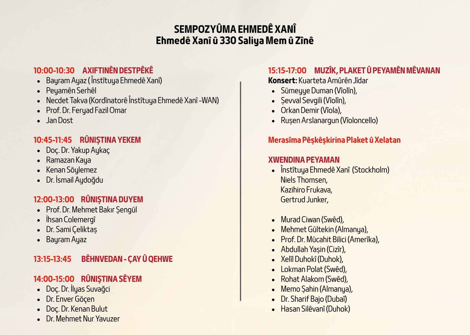Enstitü, sosyal medya platformu X üzerinden yaptığı açıklamada, sempozyumun "Ehmedê Xanî ve Mem û Zîn'in 330. Yılı" başlığıyla Kürt dili, sanatı, tarihi ve kültürü üzerine olacağını belirtti.