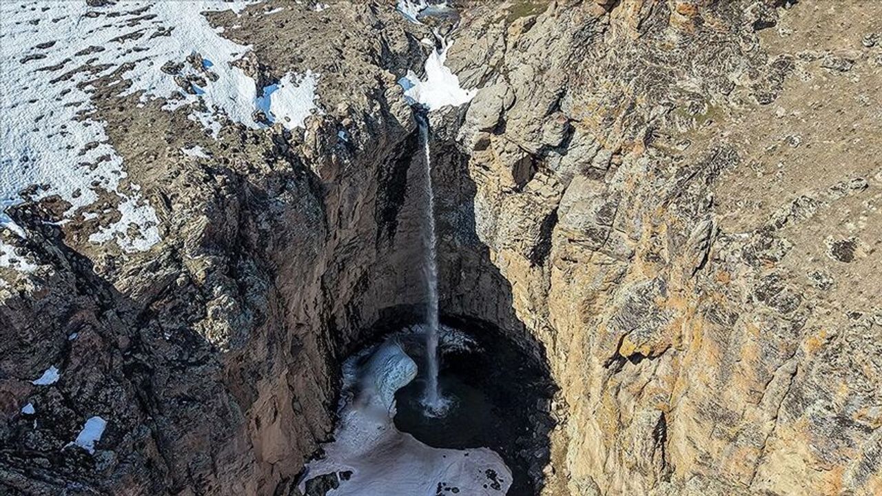 Yaklaşık 40 metre yüksekten akan şelale dron ile görüntülendi.
