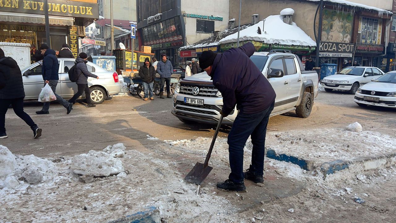 İlçede 3 tekerlekli bisikletiyle yük taşımacılığı yapan Sefer Ürek ise Cengiz Topel Caddesi'nde refüj ve kaldırım girişlerinde oluşan buzları kürekle kırıp temizledi. Ürek, bu sayede bebek arabaları ve engelli bireylerin tekerlekli sandalyelerinin rahatça geçilebilmesini sağladı.