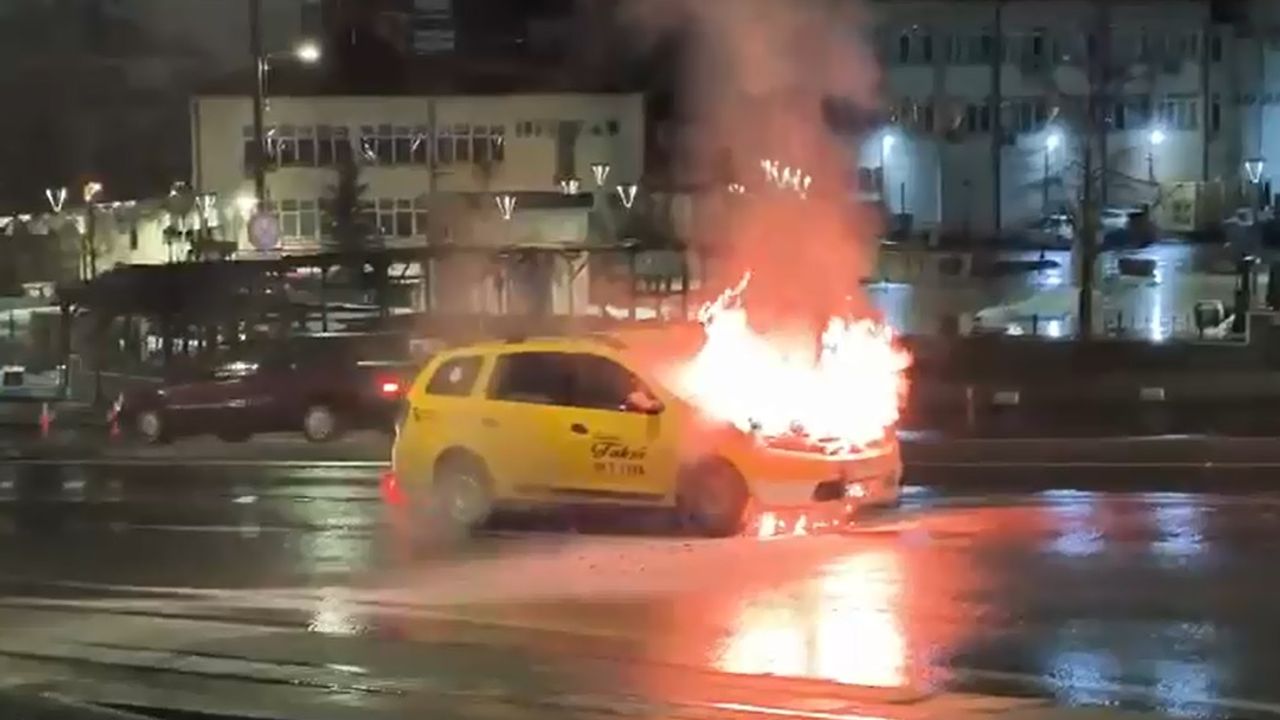 Taksinin kullanılamaz hale geldiği yangına itfaiye ekiplerinin müdahalesi cep telefonuya görüntülendi.