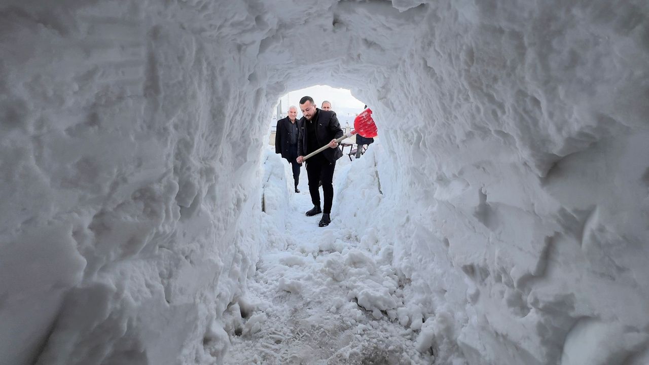 YÜKSEKOVA-İlçe merkezinde günlerce etkili olan kar yağışının ardından yollarda yapılan temizleme çalışmaları, yol ve kaldırım kenarlarında kalınlığı 2 metreyi bulan kar kütlelerini oluşmasına neden oldu. Bu durum esnafın işini zorlaştırdı. Esenyurt Mahallesi’nde gıda satışı yapan Servet Aytekin ise bu olumsuzluğu gidermek ve müşterilerinin dükkanına rahat ulaşmalarını sağlamak amacıyla tünel kazmaya karar verdi.
