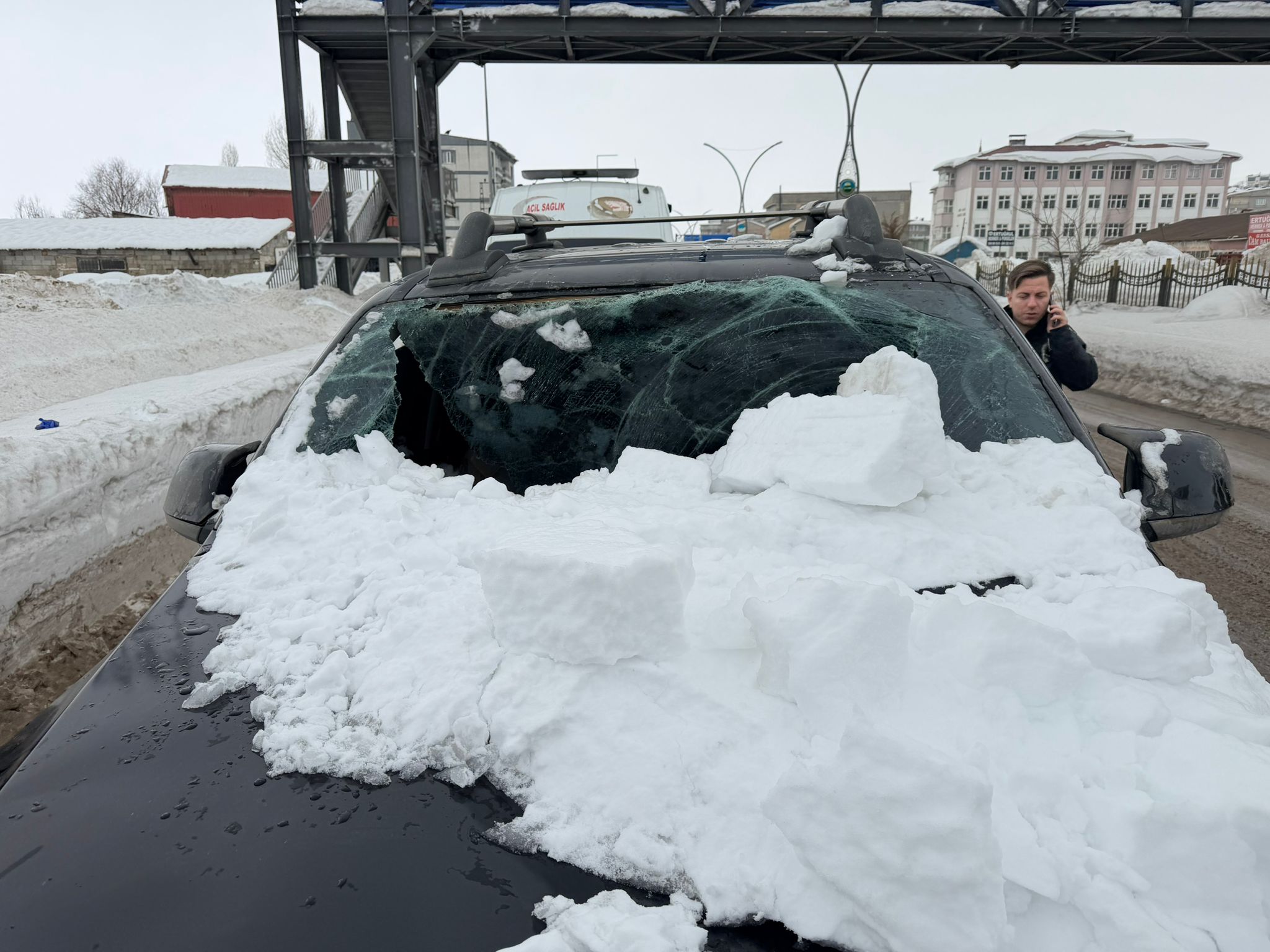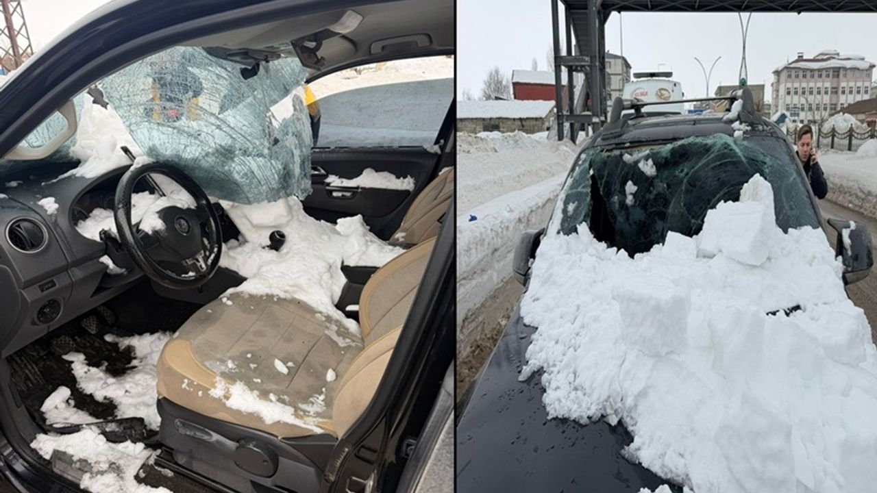 Düşen kar nedeniyle aracın ön camları kırılırken, kaportasında da ciddi hasar meydana geldi.